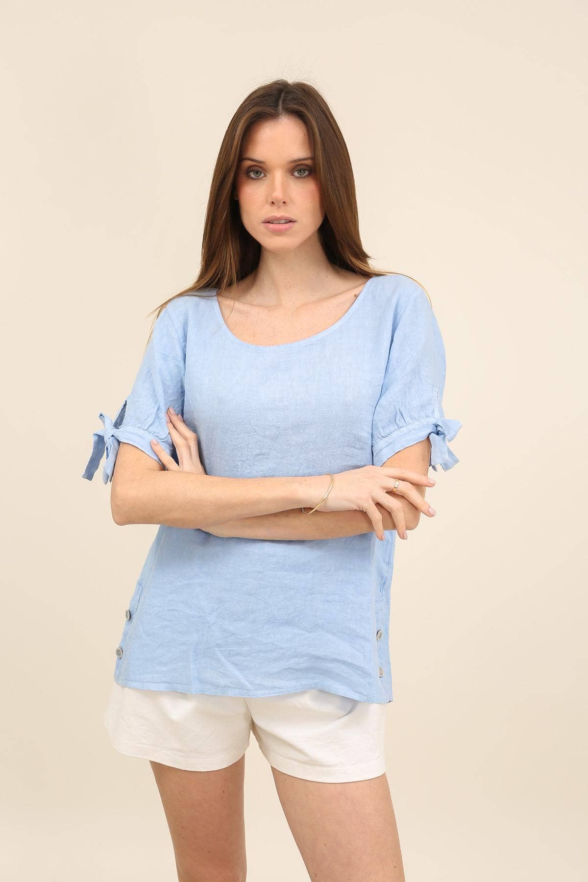 Top de satén con cuello vuelto Mangas tipo casquillo Corte holgado -La modelo lleva fucsia y musgo oscuro con una falda 60845 -La modelo lleva: S/Altura de la modelo: 5 pulgadas y 9 pulgadas
