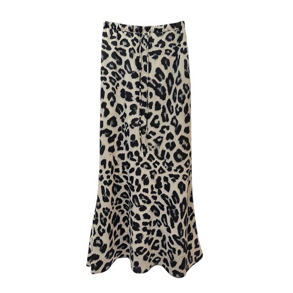 Falda satinada tipo slip con estampado de leopardo, confeccionada 100 % en poliéster. Tallas disponibles: S (8-10), M (12-14). Largo: 92 cm.