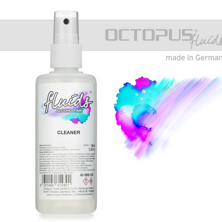 Limpiador fluido para tintas con alcohol Nuestro limpiador de fluidos fue desarrollado especialmente para su uso con las tintas de alcohol fluido. Gracias a su fórmula especial, nuestro limpiador tiene un poder de limpieza mayor que el isopropanol puro. Los aditivos adicionales garantizan un poder de disolución más alto pero suave y reducen la velocidad de evaporación. Esto hace que la limpieza sea más fácil, más exhaustiva y que llegue a su destino rápidamente con un bajo consumo de limpiador. El práctico cabezal rociador le ayuda a usar el limpiador. Use el limpiador de fluidos para hacer correcciones en sus obras de arte con fluidos y para limpiar sus equipos y superficies de trabajo. Atención: El limpiador de fluidos no está diseñado para diluir las tintas con alcohol.