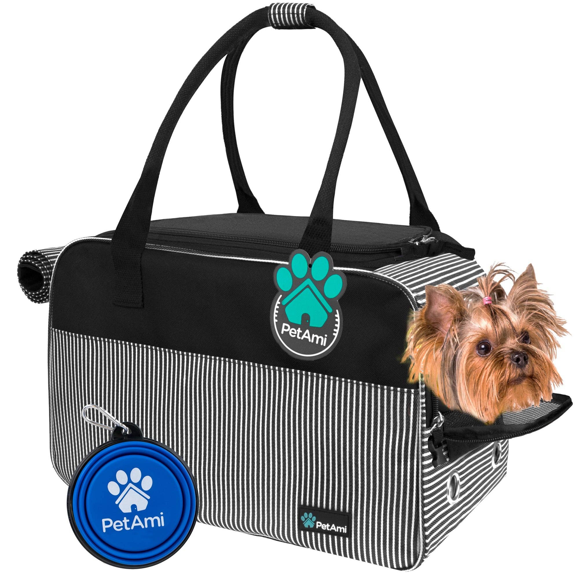 Lleva a tu mascota con comodidad y sin manos con una mochila PetAmi. Diseñada con atención y cargada de características de confort y seguridad tanto para la mascota como para el dueño. * Estructura Reforzada: Las paredes reforzadas mantienen la forma y evitan que la bolsa se colapse * Entrada Lateral de 3 Vías: Dos grandes entradas laterales y una entrada trasera para facilitar y conveniencia al cargar a tu mascota * Cama de Sherpa: La base sólida también es una cama de Sherpa para mantener a tu amigo peludo cómodo * Funcional: Bolsillo dispensador de bolsas para excrementos, múltiples bolsillos de almacenamiento * Bien Ventilado: Ventanas de malla para un flujo de aire abundante y para que la mascota pueda asomarse * Seguro y Protegido: Correa de seguridad interior que se sujeta al collar de la mascota para evitar escapes y lesiones * Soporte Adicional para la Espalda: Correas de hombro gruesas, correa de cintura ajustable y correas de pecho ayudan a distribuir el peso Especificaciones del Producto * Material: Poliéster 600D * Aprobado por Aerolíneas: Sí * Límite de Peso: 18 libras * Accesorios Incluidos: Etiqueta de identificación, cama forrada de sherpa * Medidas: 12.5 x 10.2 x 16.3 pulgadas (L x A x H) Nota: Por favor, mide a tu mascota antes de comprar. Longitud: del cuello a la base de la cola; altura: del suelo a la parte superior del hombro. Instrucciones de Cuidado * Limpiar con agua jabonosa