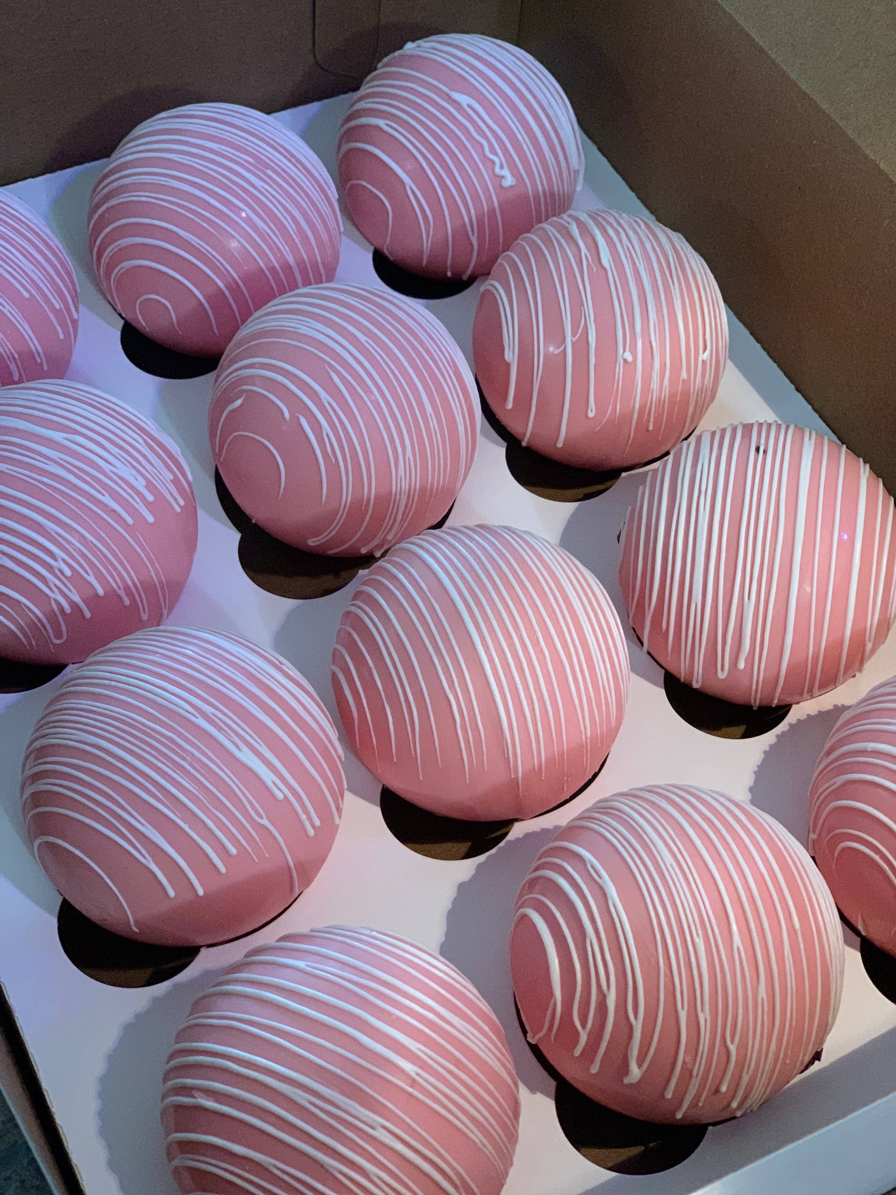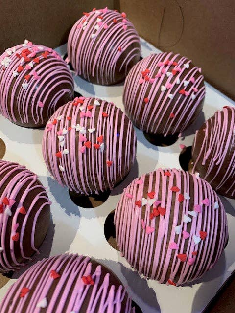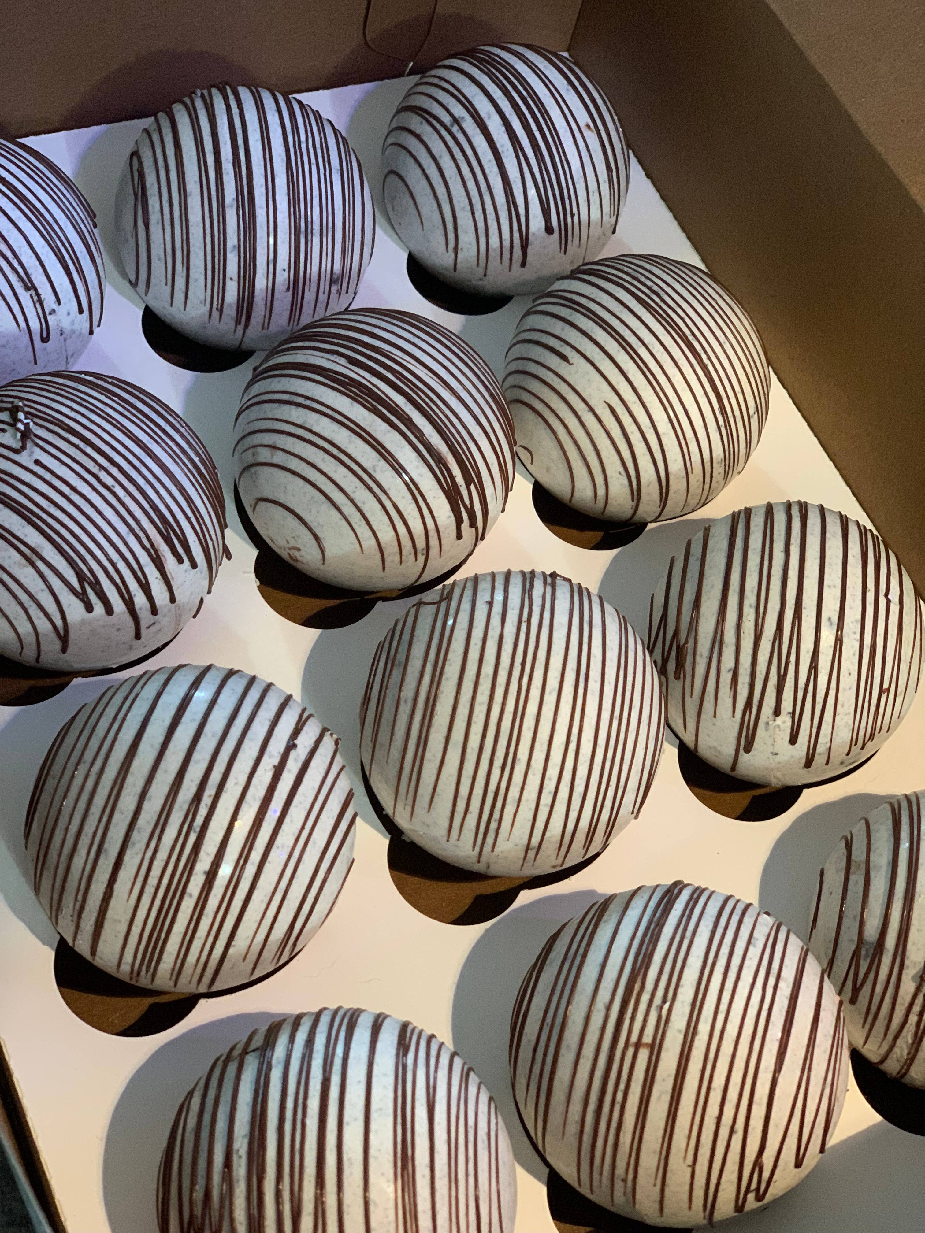 Delicias cremosas de chocolate negro en cada sorbo. Estas bolas cuentan con nuestra cáscara de chocolate negro, una mezcla hecha a mano de chocolate negro con cacao y espresso en polvo, una gran cantidad de malvaviscos y cubiertas con un chorrito de chocolate blanco. Todas nuestras bolas de cacao con chocolate negro están hechas con chocolate auténtico e ingredientes de alta calidad. ¿Cómo se empaquetan? Nuestras bolas de cacao se empaquetan individualmente en bolsas transparentes con una cinta de satén de colores a juego. Cada paquete contiene una etiqueta con instrucciones sobre cómo disfrutar de la bomba. La parte posterior del paquete contiene una etiqueta con el sabor de la bola de cacao y la lista de ingredientes. ¡Todo lo que necesita para estar listo para su reventa inmediata! ¡No te decepcionará!