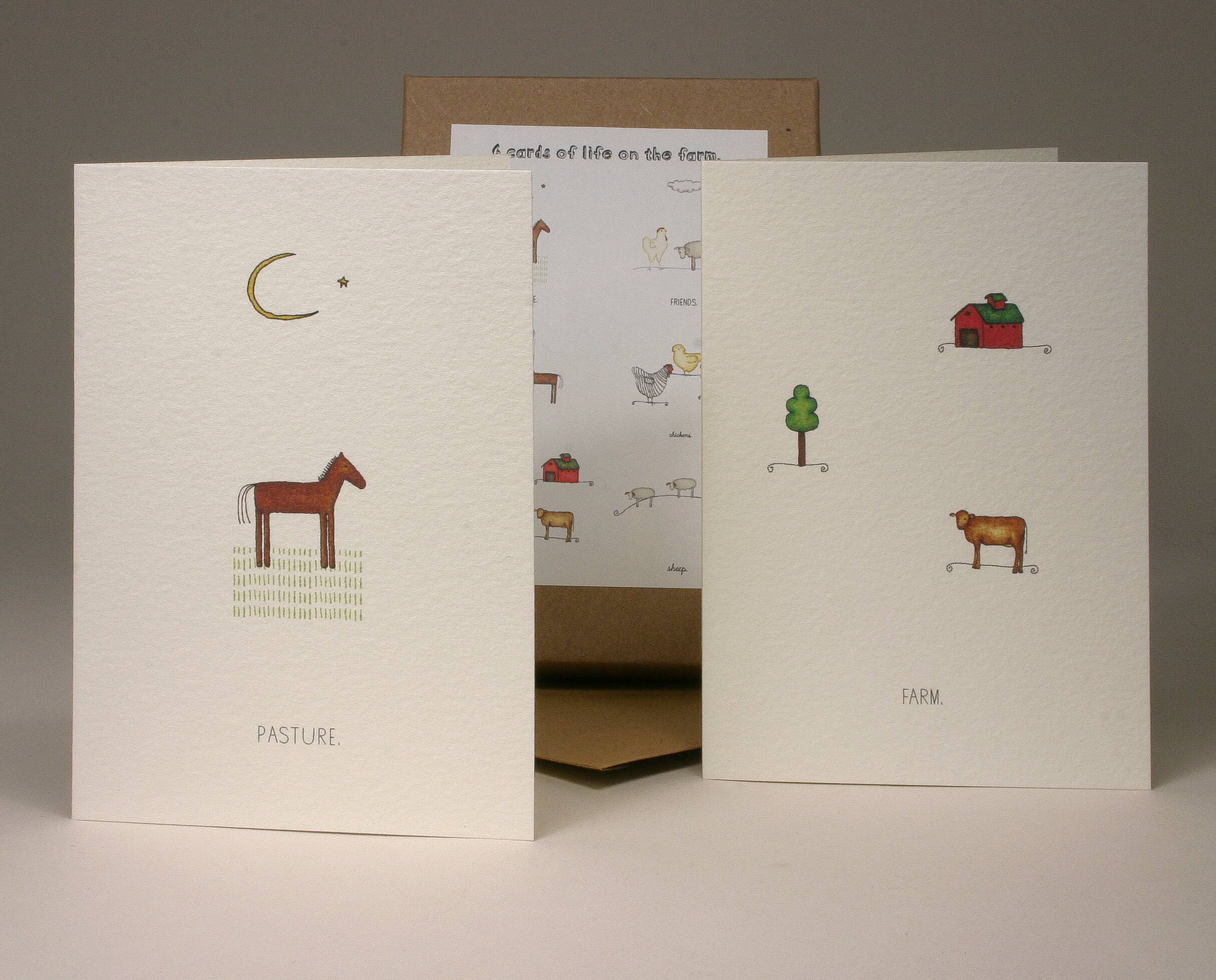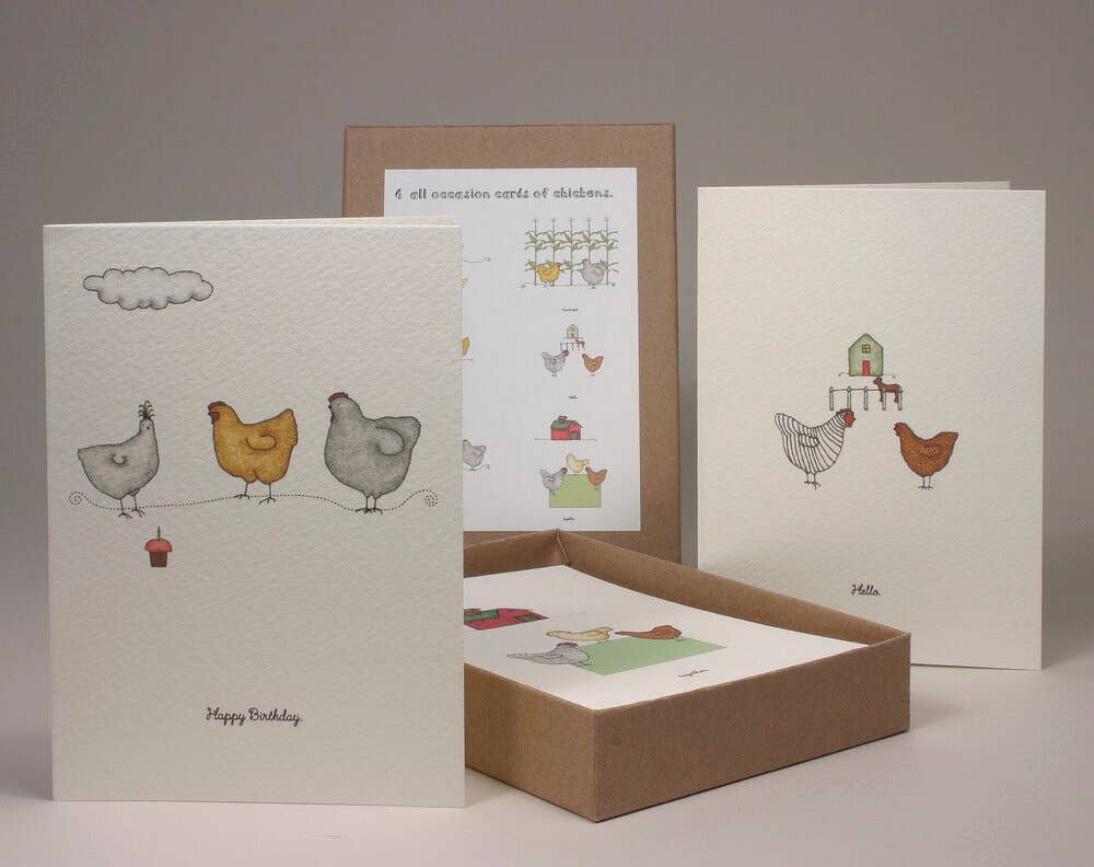 Una nueva caja de 6 tarjetas (3.5 pulgadas x 5 pulgadas) con ilustraciones de pollo, para todas las ocasiones. Cada uno está impreso a partir de un dibujo a lápiz de color original. El interior está en blanco. Impreso en magnani arturo pesado y viene acompañado de un bonito sobre pesado. Con amor de nosotros para ti.