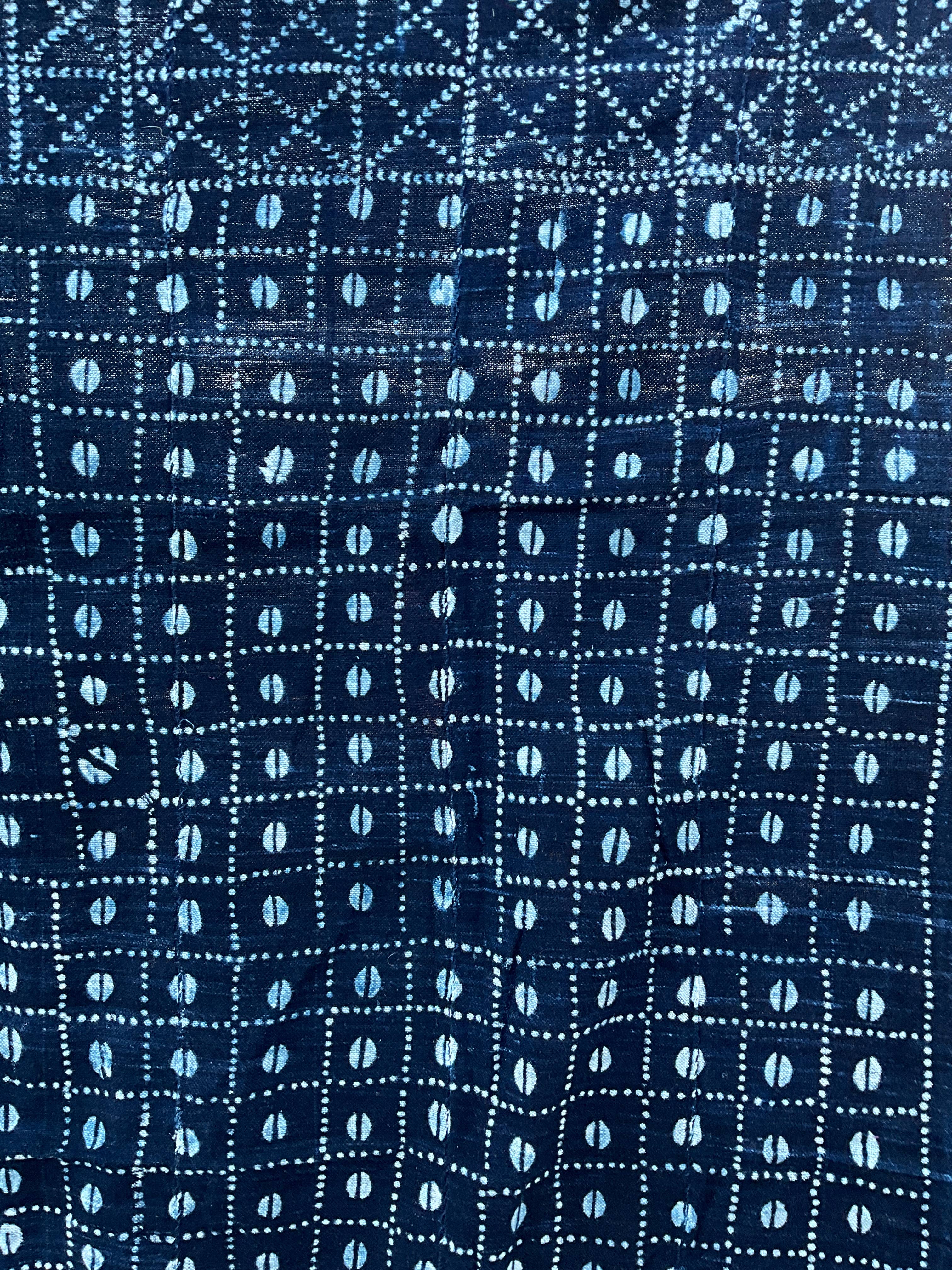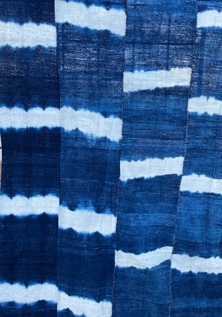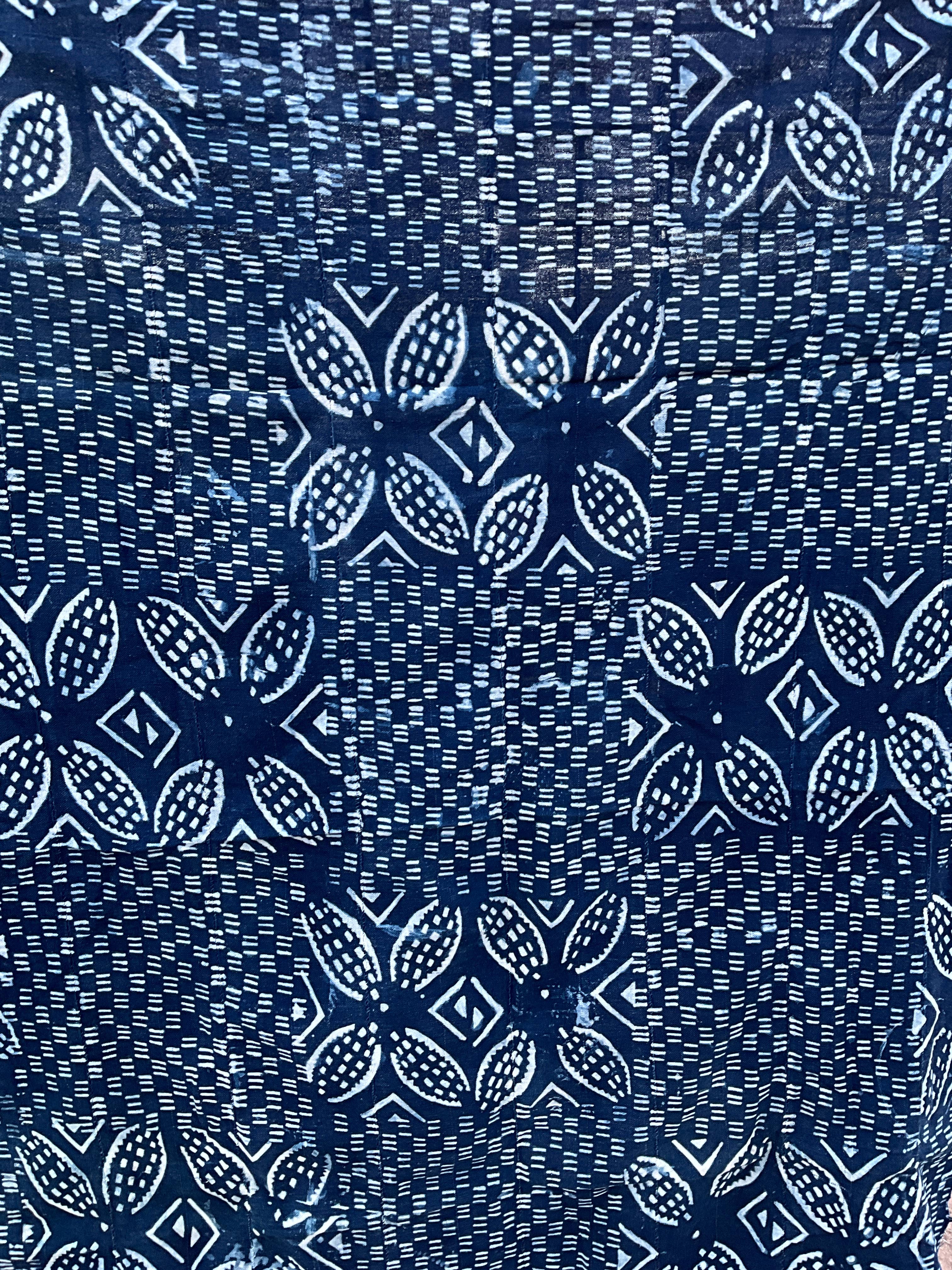 Tiras tejidas a mano de algodón hilado a mano se cosen primero juntas para formar paneles. Luego, hay dos métodos para crear diseños en la tela. El primero es el método de teñido anudado, donde los diseños se cosen en la tela; una vez terminado, la tela se sumerge en índigo natural. Una vez seca, se cortan los hilos para revelar el diseño final. El segundo método utiliza plantillas o sellos hechos a mano para impregnar cera en la tela antes de sumergirla en el índigo. La forma más fácil de saber qué método se utilizó es mirar la parte trasera del panel y ver si el diseño es visible. Si lo es, es el método de teñido anudado. Estos paneles tienen muchos usos en África Occidental: ropa, pañuelos para la cabeza, portabebés, etc. El índigo pertenece a la familia de las leguminosas. Dimensiones: 152 cm x 112 cm