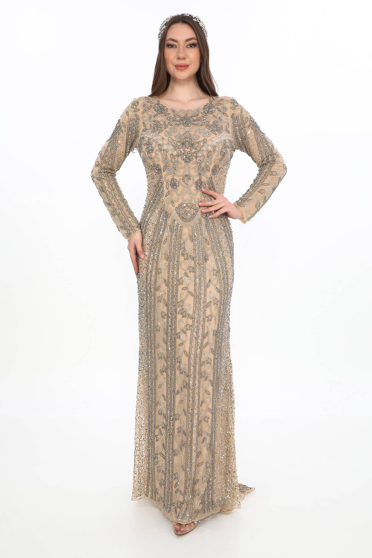 Luce elegante con este impresionante vestido de noche negro de encaje, diseñado para destacar con estilo. Su silueta ajustada realza las curvas, mientras que los intrincados patrones de encaje aportan un toque de sofisticación. Con mangas acampanadas dramáticas y un cuello alto, este vestido combina modestia con alta moda. Ideal para bodas, galas y ocasiones especiales, este vestido te asegura irradiar gracia y encanto dondequiera que vayas. Combínalo con un hiyab elegante y pendientes llamativos para un look refinado y glamuroso.