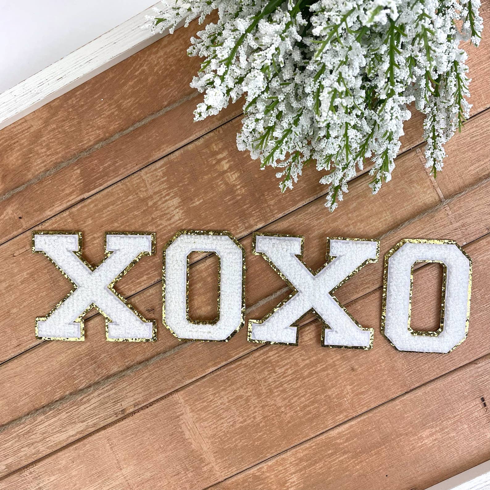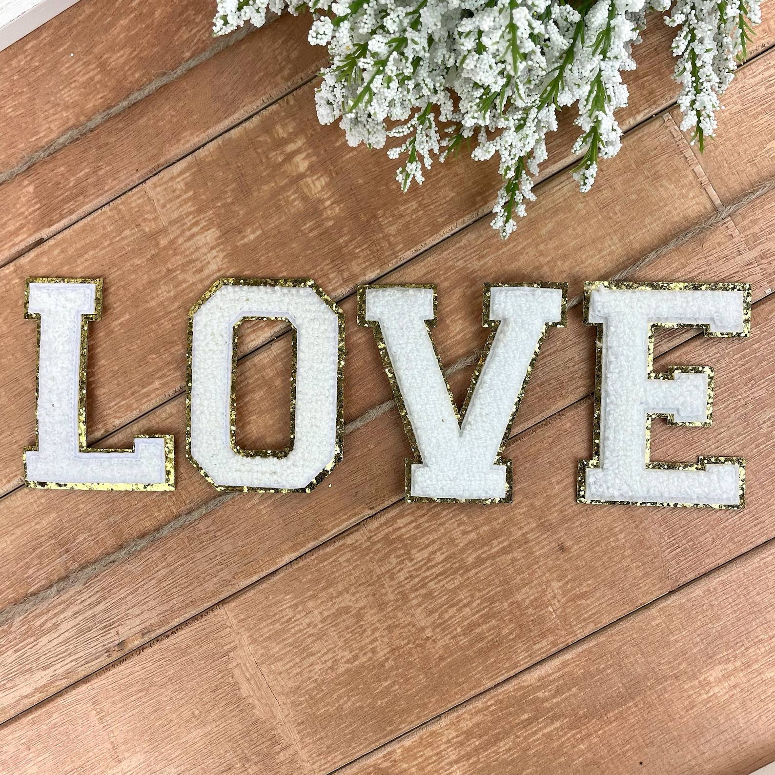 Juego de 5 parches de chenilla que deletrean CHEER. Aplicamos nuestros parches con una prensa térmica a 350* durante 30 segundos. ¡Estos parches termoadhesivos son perfectos para tus proyectos de bricolaje! Ideal en bolsas de maquillaje, bolsas de mano, suéteres, camisetas y más. Dimensiones: 3 pulgadas x 3 pulgadas (aproximadamente) por letra *Los tamaños varían ligeramente entre cada letra* Fieltro blanco con ribete dorado brillante Estos parches también se pueden coser para mayor seguridad.
