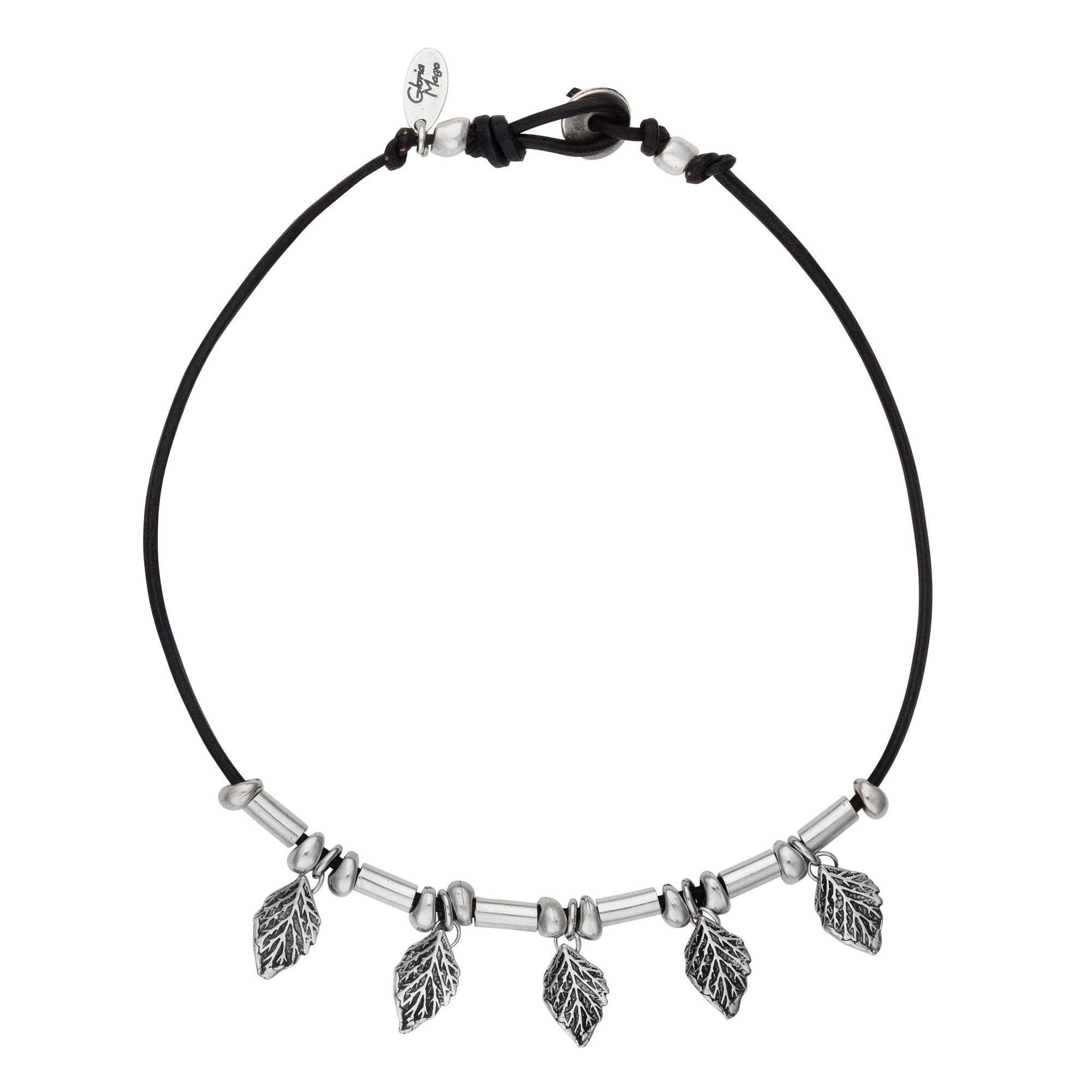 Collar en cuero y plata chapada. Antialérgico. Diseñado y fabricado en España de modo artesanal y sostenible. Diseño exclusivo Gloria Mago. Se entrega con etiqueta, expositor, bolsa o caja de la marca.
