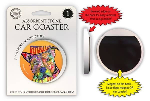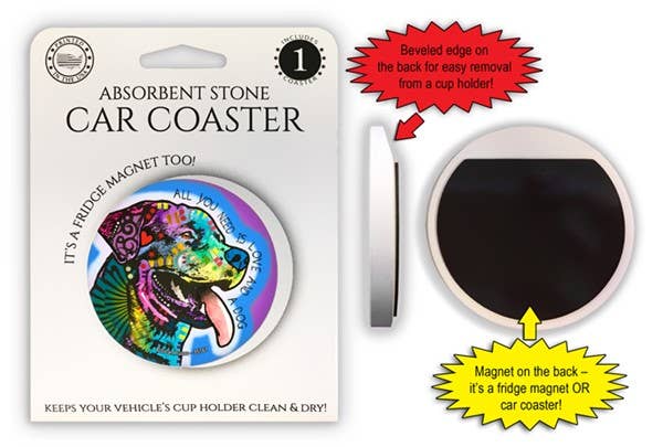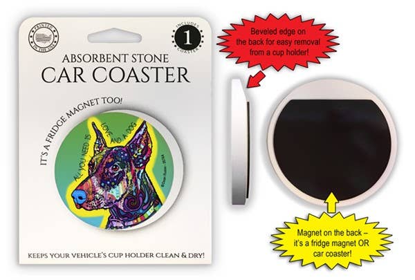 Posavasos de piedra absorbente para coche con forma de cachorro de dóberman, todo lo que necesitas es amor y un perro, de 2,6 pulgadas, es un imán para nevera o es un posavasos para coche. Mantiene limpios los portavasos del coche. Cuenta con la obra de arte de Dean Russo