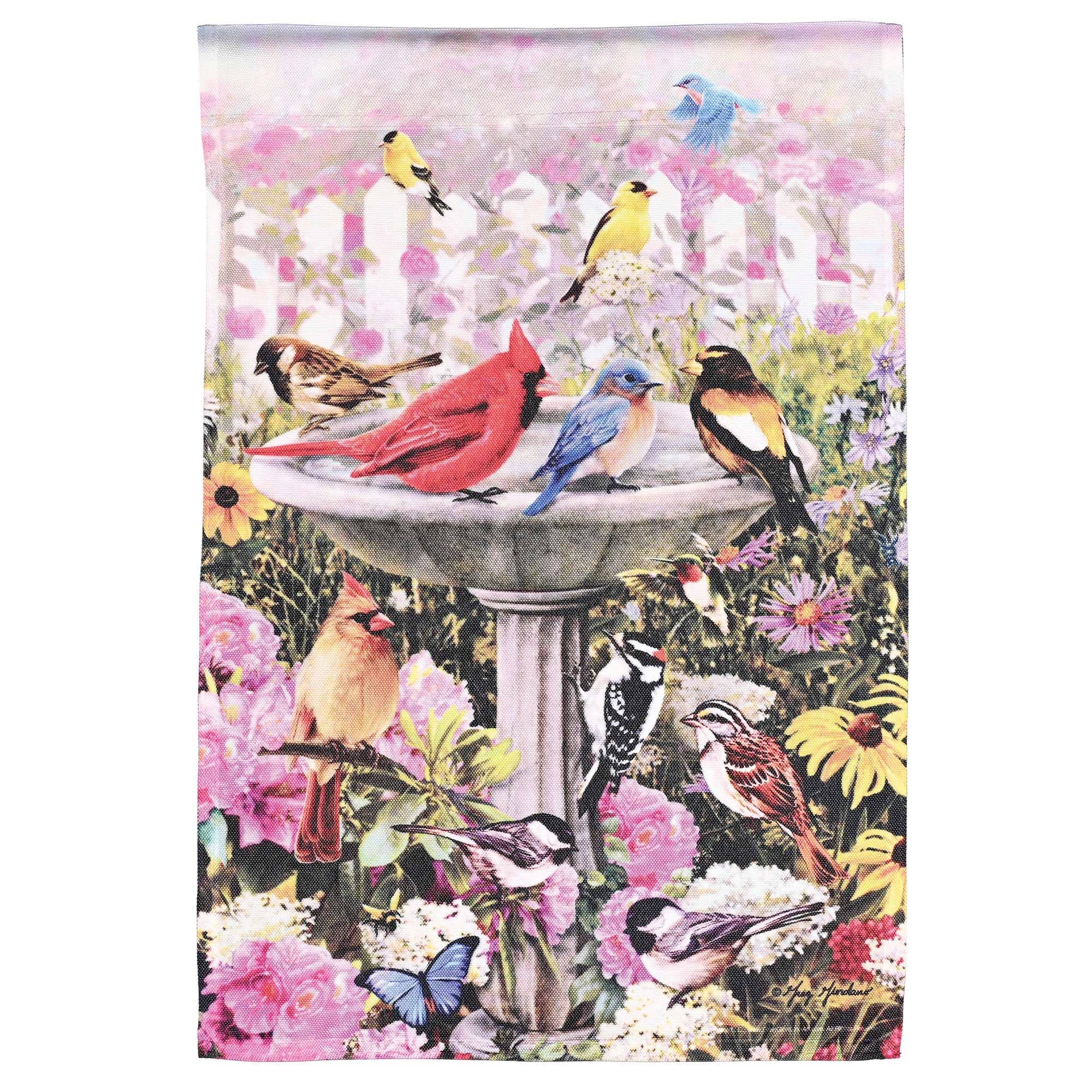 La bandera impresa de tamaño jardín mide 13 x 18 pulgadas. El diseño se sublima para convertirse en parte de la tela, no solo se imprime en la superficie. De poliéster resistente de 650 denier, esta bandera ofrece una calidad excepcional a un precio asequible. La bandera es de un solo grosor; el diseño es igual en la parte delantera y trasera. La luz que brilla desde atrás crea un efecto de vitral. La bandera conservará su color y belleza durante años si se muestra en sombra o semisombra, y es resistente a la lluvia. Asta de bandera no incluida.