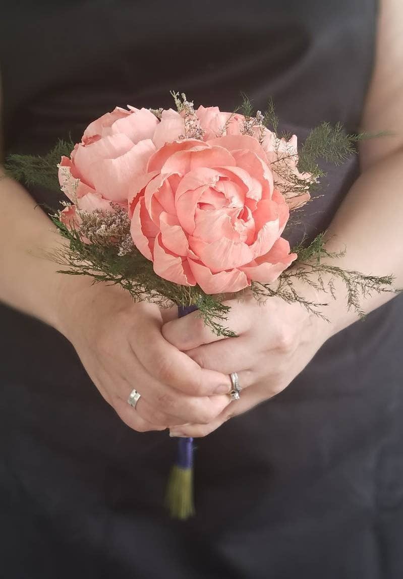 ¡Esta posey de peonía pintada y arreglada a mano es el ramillete perfecto para regalar en San Valentín! Maestras, amantes, mamás: este bonito ramillete las sorprenderá a todas, ¡y se sorprenderán de que sus flores durarán para siempre! El ramo viene perfumado con aceite aromático de peonía y envuelto en papel de seda para una presentación bonita. ¡Añade un jarrón transparente para cogollos a tu pedido por 8$ más! (La altura de los floreros varía de 4 a 6 pulgadas; los tallos de las flores se recortarán para que quepan perfectamente en el jarrón si eliges esta opción) Las hojas variarán a medida que coseche los tallos de las flores de seda para reutilizarlos.