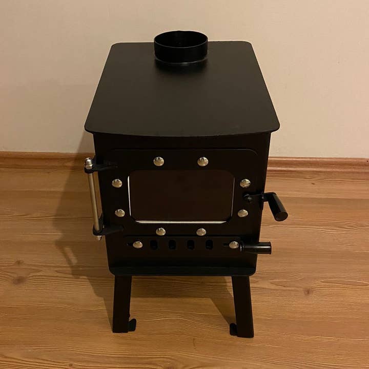 Estufa de leña mini para tienda hecha a mano, ideal para camping. - Fabricada con chapa metálica resistente de 2 mm o 3 mm - Peso: 12 kg - Acabado en acero negro elegante - Tiempo de fabricación: 1-2 días - Diámetro del tubo de humo: 10 cm - Combustible: madera seca - No incluye tubos - Opcional cenicero para estufa disponible