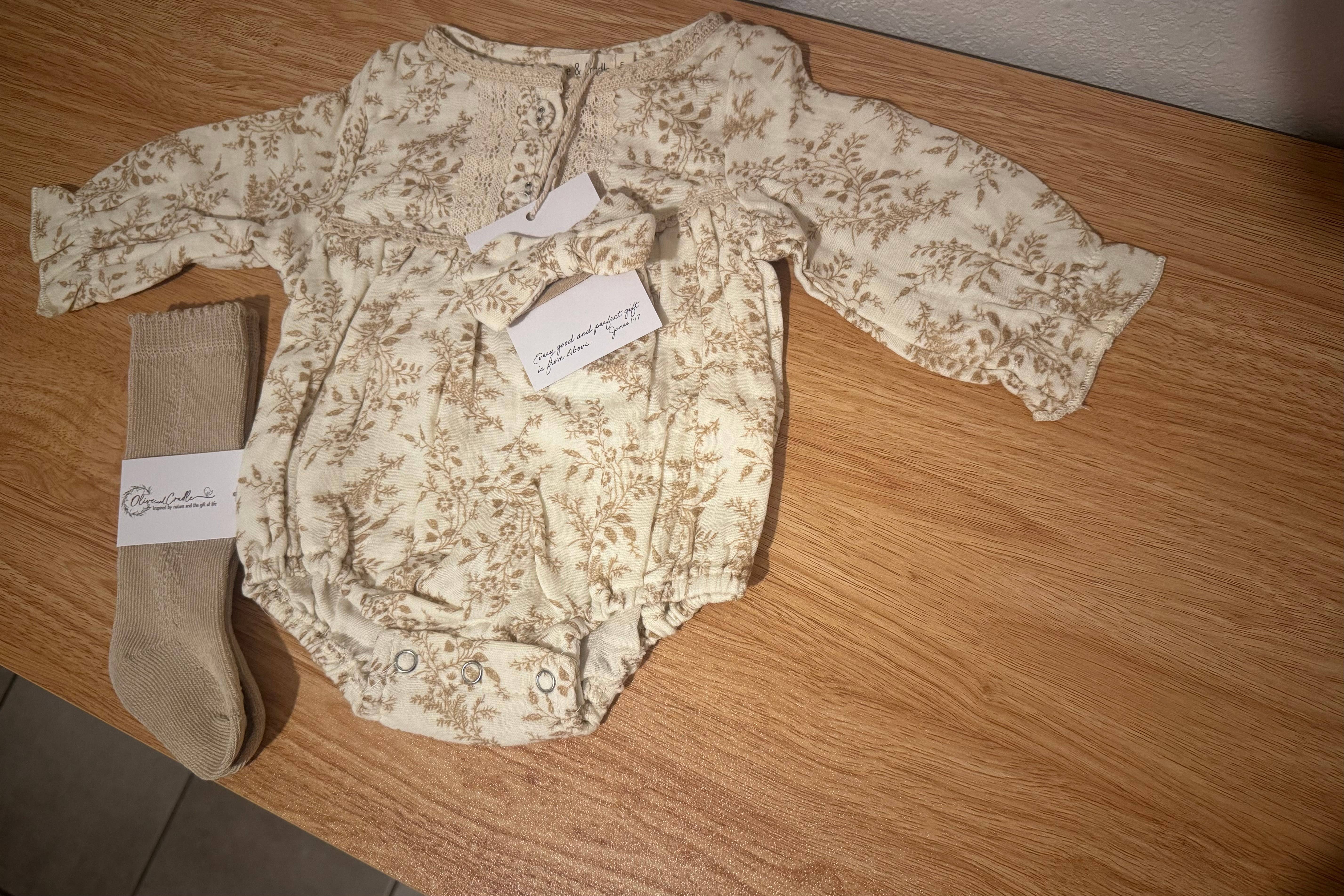 Viste a tu pequeño con un encanto clásico esta temporada navideña con nuestro conjunto de Pelele de Bebé a Cuadros Crema de Olive and Cradle. Este encantador conjunto incluye: * Pelele a Cuadros Crema: Un diseño de cuadros atemporal con un cuello Peter Pan y detalles de botones de madera para un toque sofisticado. El pelele tiene aberturas elásticas suaves en las piernas para mayor comodidad y un cierre a presión para facilitar el cambio de pañales. * Lazo a Juego: Un lazo de tela a cuadros coordinado en una banda suave y elástica para completar el conjunto sin esfuerzo. * Calcetines Sólidos Acogedores: (opción adicional) Calcetines cómodos y cálidos en un tono neutro a juego que complementan perfectamente el pelele. * Peluche de Ciervo de Crochet Opcional: (opción adicional) Añade un toque caprichoso a tu regalo con nuestro peluche de ciervo de crochet hecho a mano, haciendo de este conjunto un regalo ideal para la primera Navidad del bebé o una ocasión especial de invierno. Por Qué Te Encantará: * Hecho de una mezcla de algodón de alta calidad y transpirable para comodidad y durabilidad. * Perfecto para fotos familiares navideñas, fiestas de Navidad o como un paquete de regalo considerado. * Disponible en múltiples tamaños para adaptarse a recién nacidos hasta 24 meses. Instrucciones de Cuidado: Lavar a máquina en frío, secar a baja temperatura. Para obtener mejores resultados, lavar el lazo y los calcetines en una bolsa de prendas delicadas.