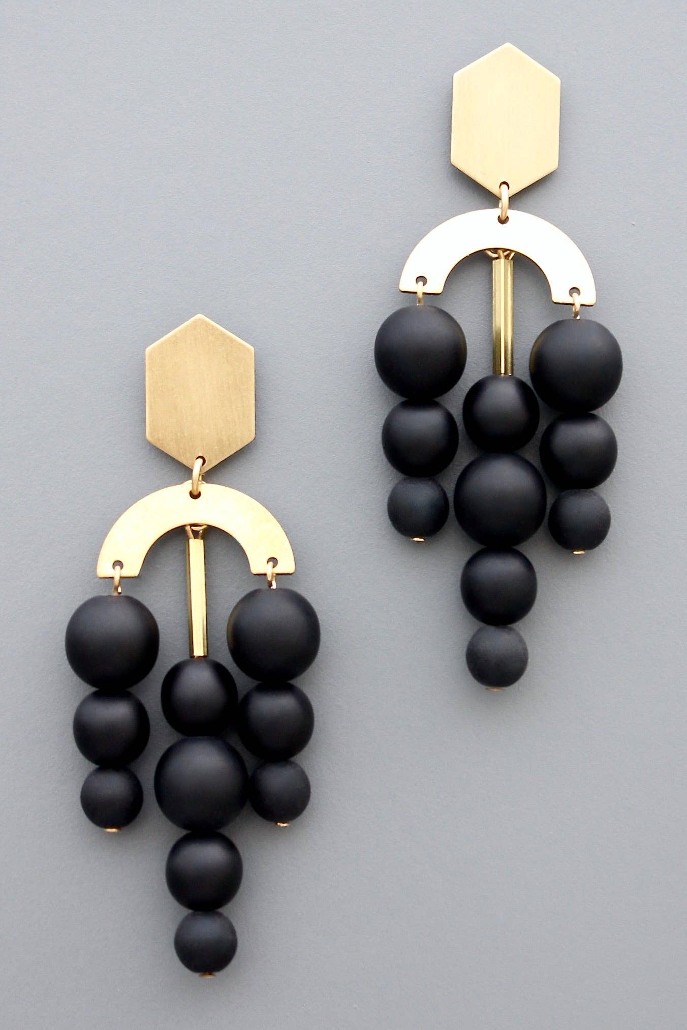 Postes de latón con vidrio mate negro azabache. Cada medio par pesa 0,63 oz y mide 3,375 pulgadas.
