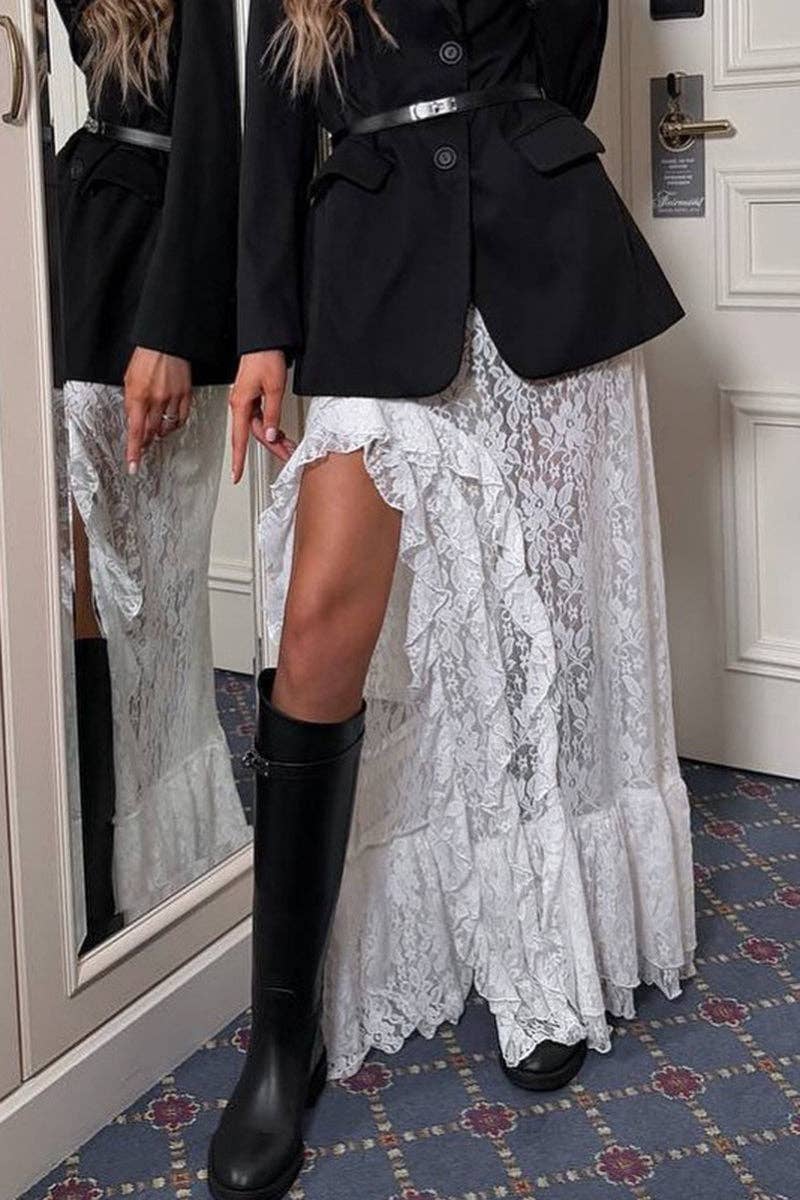 Tu nueva minifalda chic presenta delicados volantes de encaje y un corte coqueto. Perfecta para el día o la noche, añadiendo un encanto sin esfuerzo a cualquier look. Tejido: 95% poliéster, 5% elastano Peso: 0,35 kg