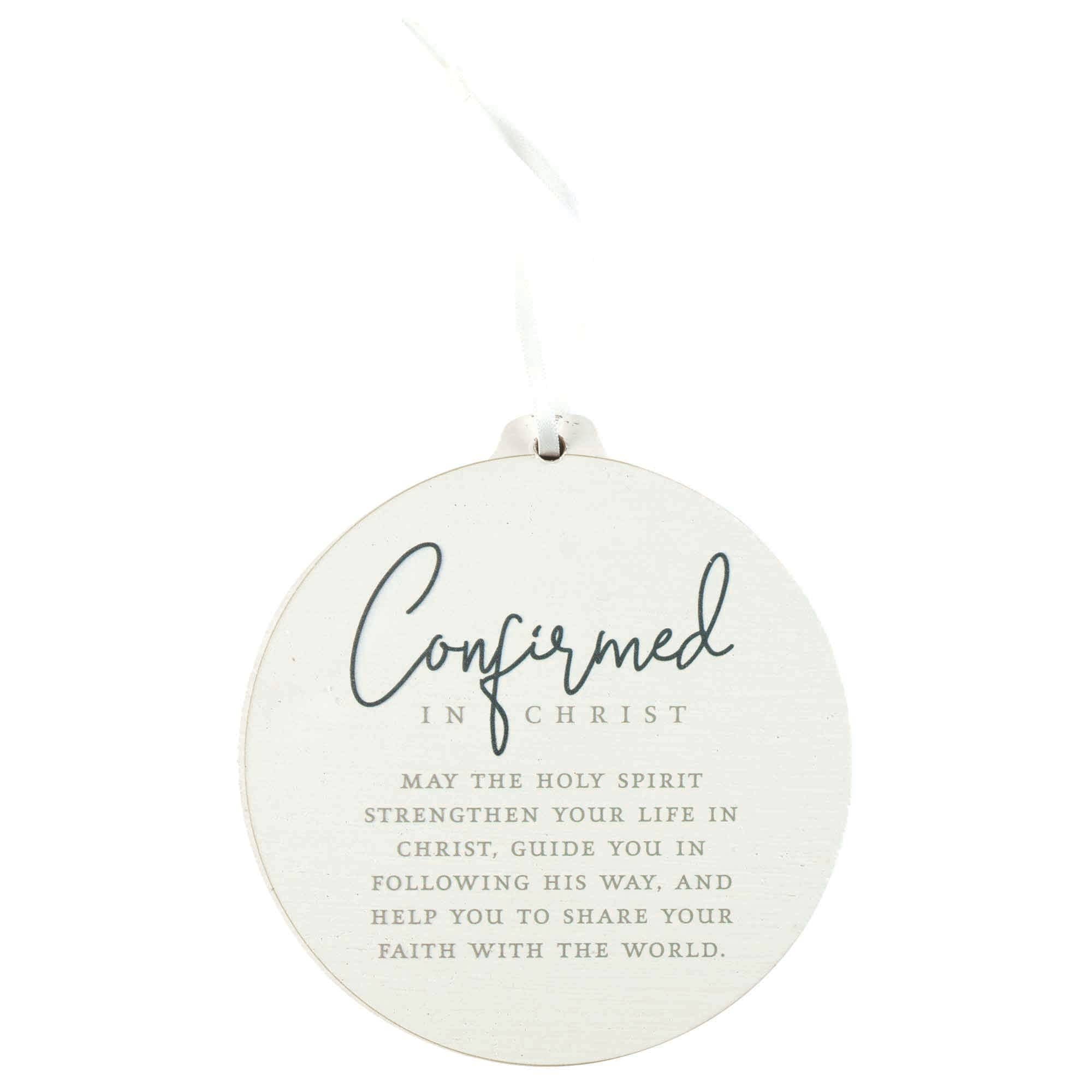 Este adorno muestra el texto de la Primera Comunión: Que el Espíritu Santo fortalezca tu vida en Cristo, te guíe en su camino y te ayude a compartir tu fe con el mundo. Este adorno de doble cara tiene espacio para escribir información sobre la primera comunión especial, con Romanos 15:13, esto se superpone a un cáliz. El adorno de 10 cm de diámetro está hecho de madera MDF con un acabado blanco.