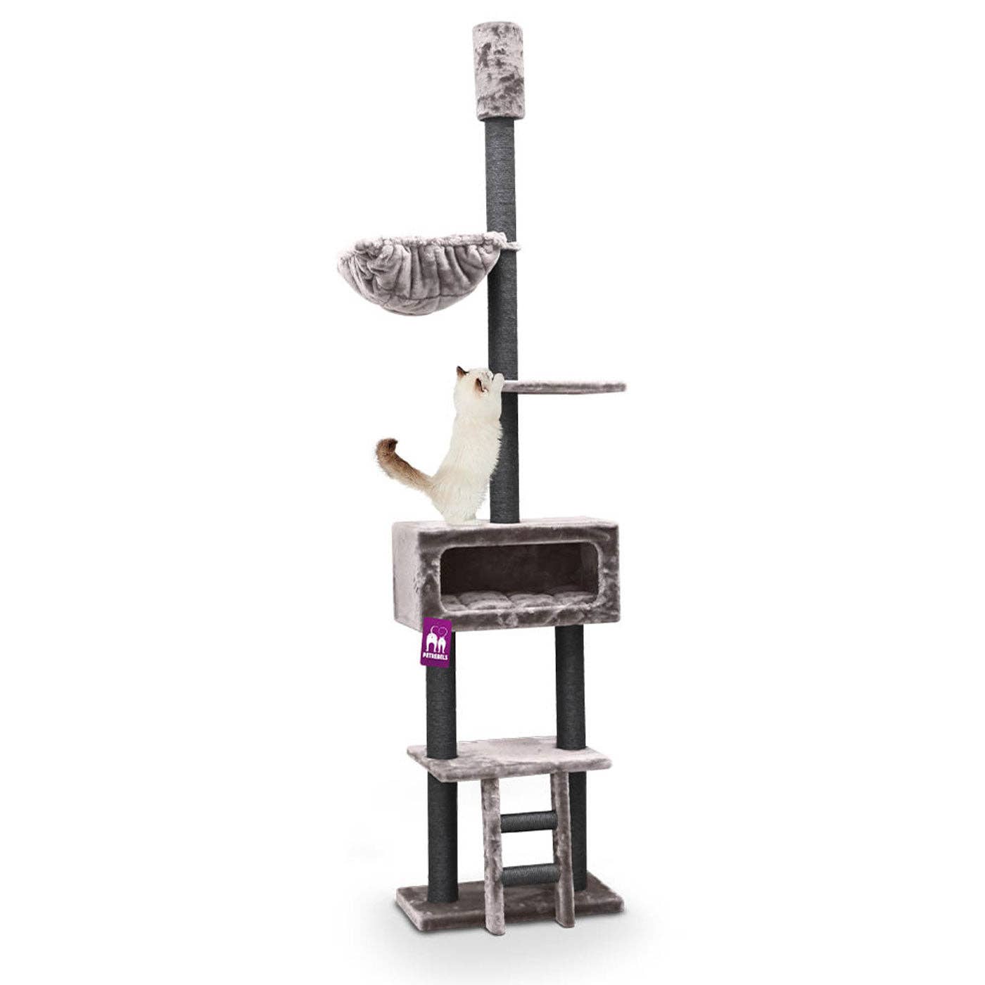 El loft combina miradores y escondites para crear el árbol rascador perfecto. Cuenta con múltiples plataformas para que el gato pueda sentarse, una cómoda hamaca para acurrucarse y un nivel superior cerrado que sirve como mirador. Incluye una cuerda colgante para los momentos de juego y tres grandes postes rascadores para satisfacer sus instintos naturales. Su color beige neutro se integra fácilmente en cualquier interior.