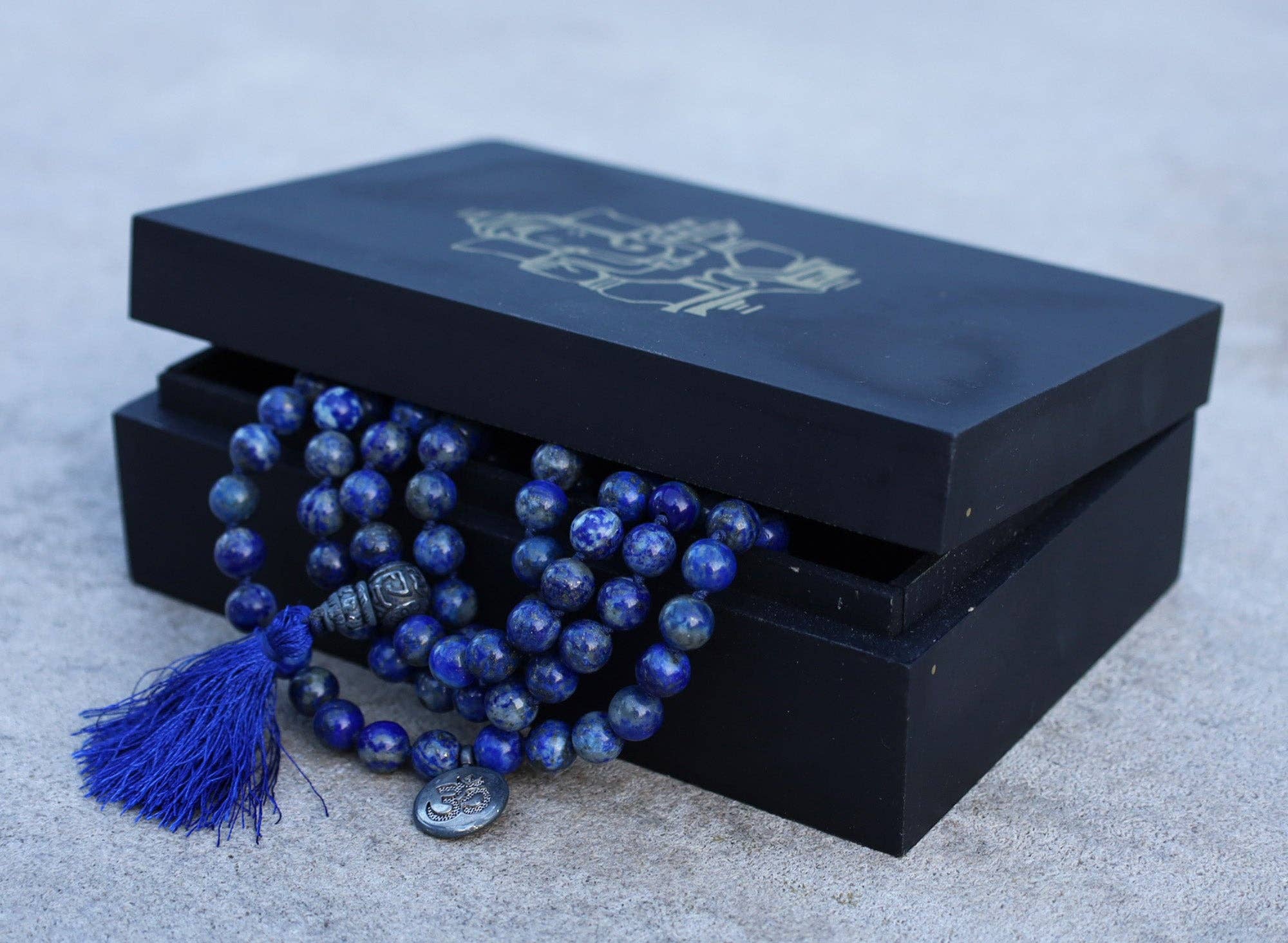Una mala verdaderamente intencional: cuentas de semillas de Bodhi de 46" con tres acentos de concha tallados con el símbolo Om, un cordón ajustable rojo y dorado, y una caja de madera para su protección, hecha para una práctica significativa. ¡¡Gran calidad!!