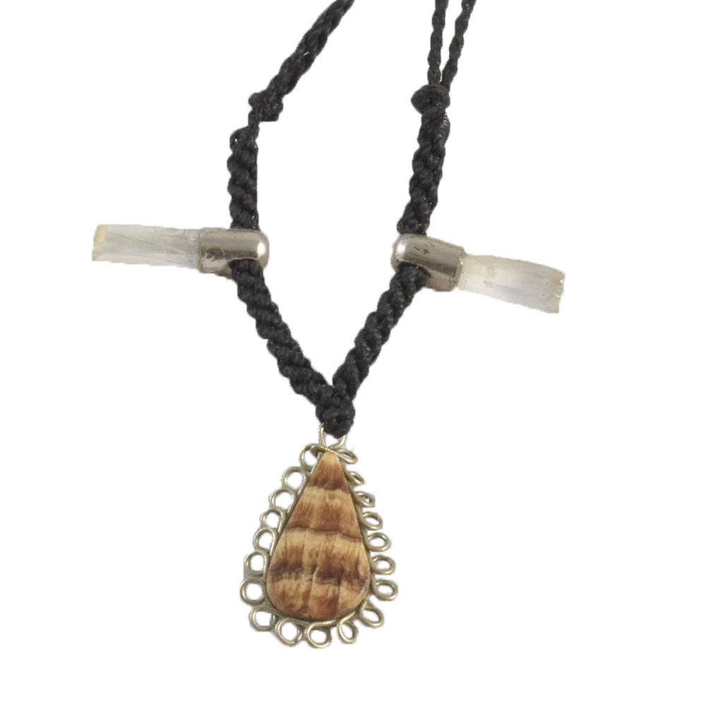 Este elegante collar de estilo boho presenta un centro de sodalita, una sección transversal lacada de la vid de ayahuasca y varias cuentas de piedra más pequeñas incrustadas en un diseño de macramé de hilo encerado. La ayahuasca es utilizada por muchos chamanes amazónicos en ceremonias tradicionales. Cada collar tiene un cordón encerado con dos nudos que permiten ajustar fácilmente la longitud para colocarlo sobre la cabeza y luego apretarlo. Los collares fueron hechos por artesanos expertos de Iquitos. Por favor, recuerde que cada pieza de piedra es única, por lo que el patrón variará del que aparece en la foto principal de este producto. Modelo: NK152P32