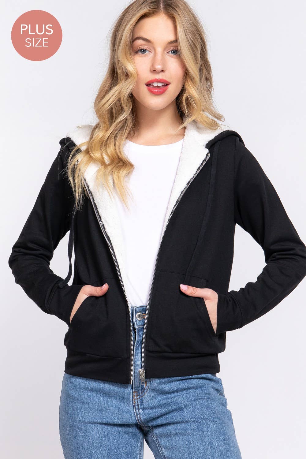 CHAQUETA DE FELPA FRANCESA CON CAPUCHA Y CREMALLERA DE PIEL SINTÉTICA INTERIOR DE MANGA LARGA TELA: FELPA FRANCESA 57% ALGODÓN 38% POLIÉSTER 5% SPANDEX - active basic, active usa, interior de piel sintética, cálida, de invierno, chaqueta con capucha, cremallera en la parte delantera, a la moda, imprescindible, imprescindible