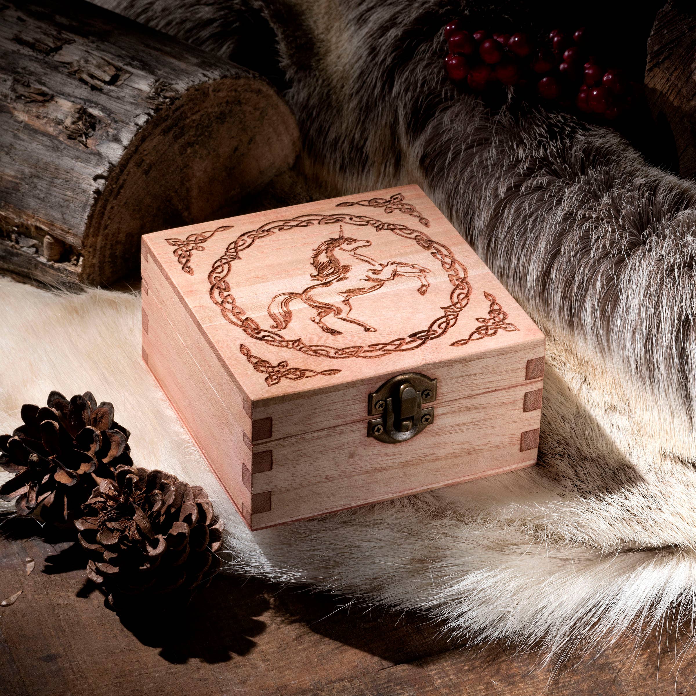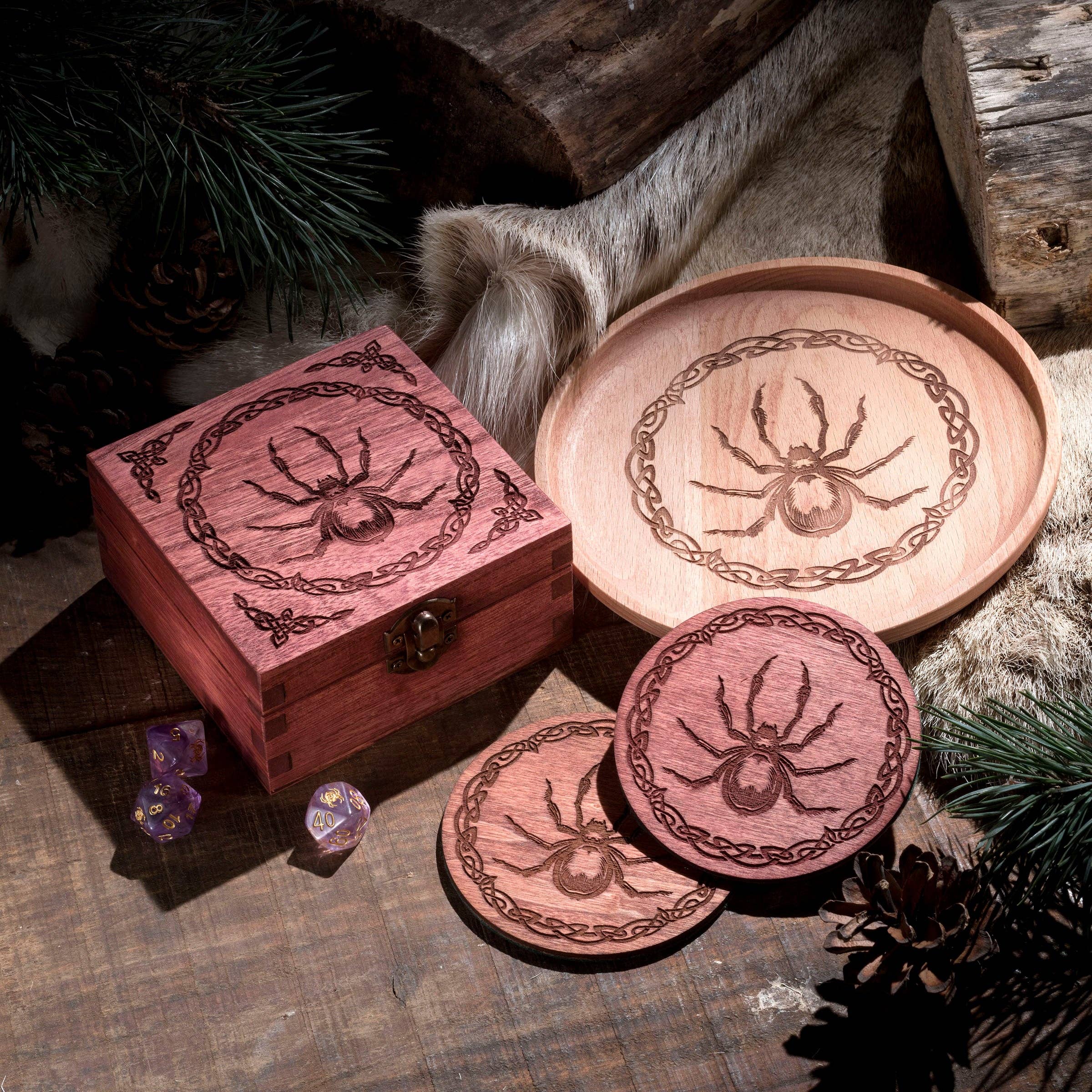 Esta caja de dados grande está grabada con el poderoso grifo y es una advertencia adecuada para aquellos que se embarcan en la aventura de los juegos de rol; úsala para mantener tus dados seguros y listos para tu próxima sesión de juego. * Dimensiones: 18 cm x 9,5 cm x 6 cm * Sostiene hasta 115 dados * Se cierra con pestillo de metal * Recubierto con una capa de aceite danés * 8 acabados de color * Opción de fieltro