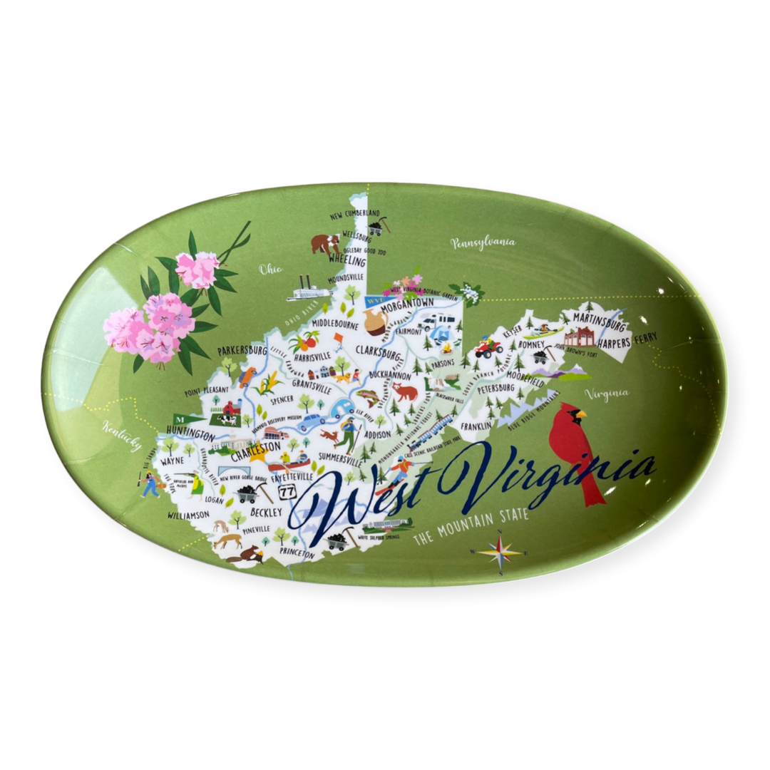 Una caprichosa representación de Virginia, destacando ciudades notables y atracciones turísticas en un vibrante plato ovalado de melamina de 16". No se puede usar en el microondas. Resistente a arañazos y roturas. Apto para lavavajillas.