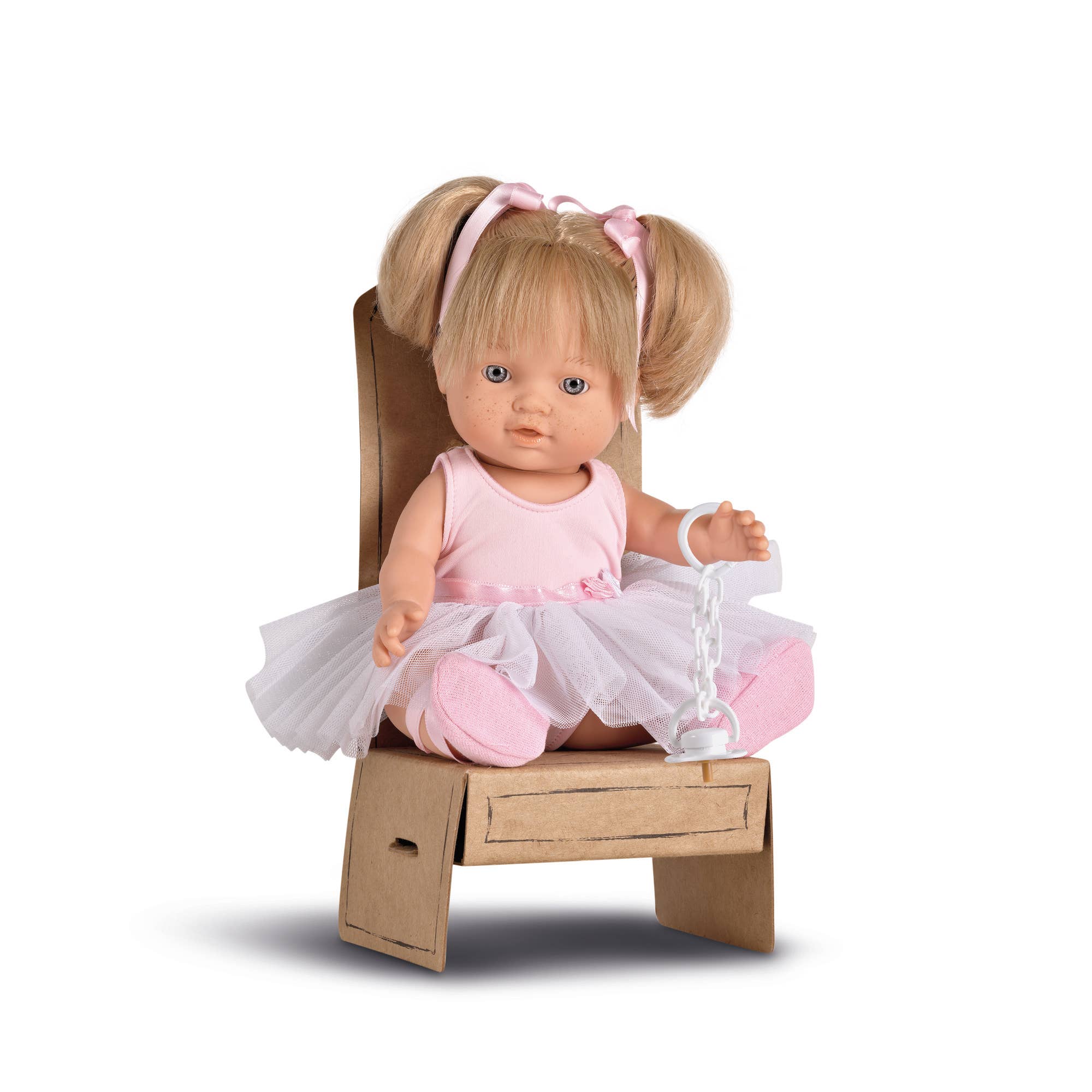 Niño 28 cm sin pelo. Muñeca anatómicamente correcta. Presentado en una divertida caja, que simula un silla. Caja ecológica fabricada en material reciclado.