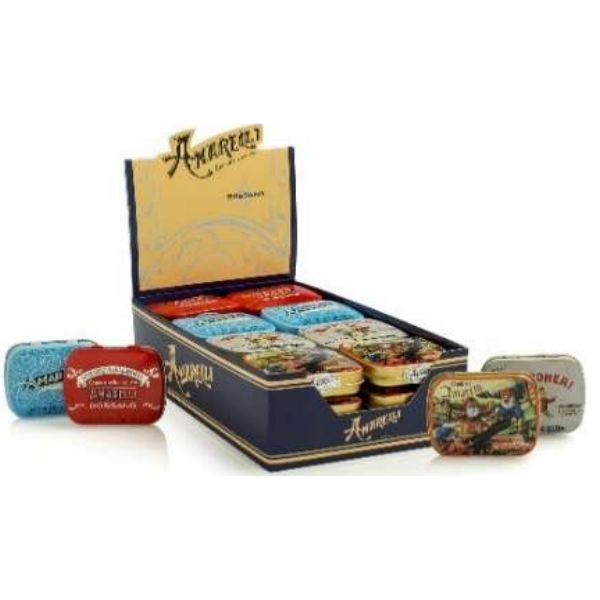 Conjunto de 36 cajas de tabletas de frutas en un expositor • 12 aromas diferentes: violeta, fresa, menta, canela, anís, aromas variados, grosella roja, arándano, naranja, limón, fruta del bosque, frambuesa • Caja de cartón (27 g) • Pantalla con 36 cajas de tabletas • Las pastillas están elaboradas con ingredientes de calidad para una experiencia de sabor excepcional
