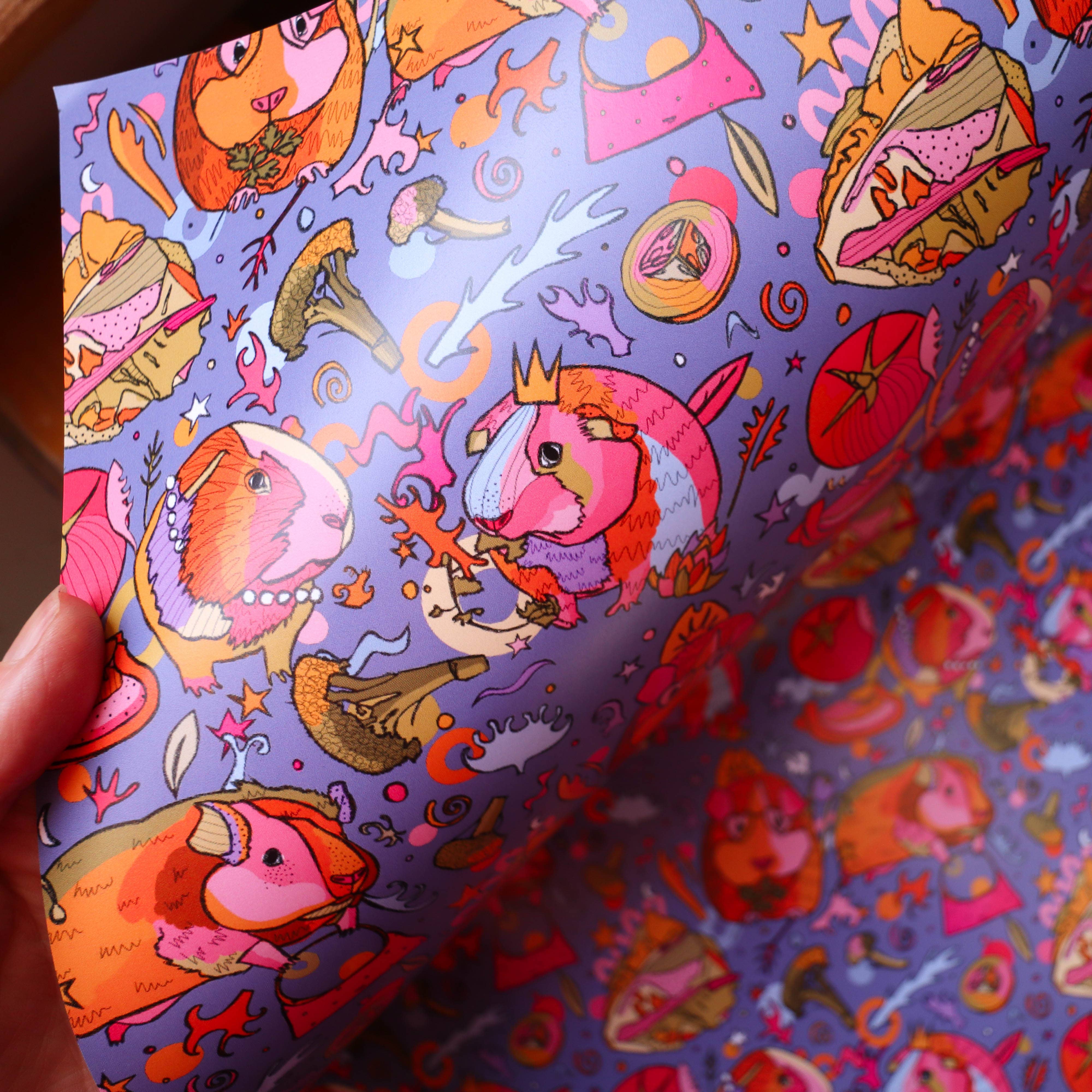 Esta colorida tarjeta de felicitación presenta mi ilustración original de un conejillo de indias con perlas rodeadas de brócoli y lechuga. Ilustrado en rosa, verde y naranja con el texto dorado «Stay Fabulous» en la parte superior izquierda. La tarjeta se pliega y se imprime en formato A6 en cartulina mixta de 300 g/m² de alta calidad aprobada por el FSC con un acabado sedoso. Empaquetado en violonchelo biodegradable con un sobre rosa fucsia. Interior en blanco.