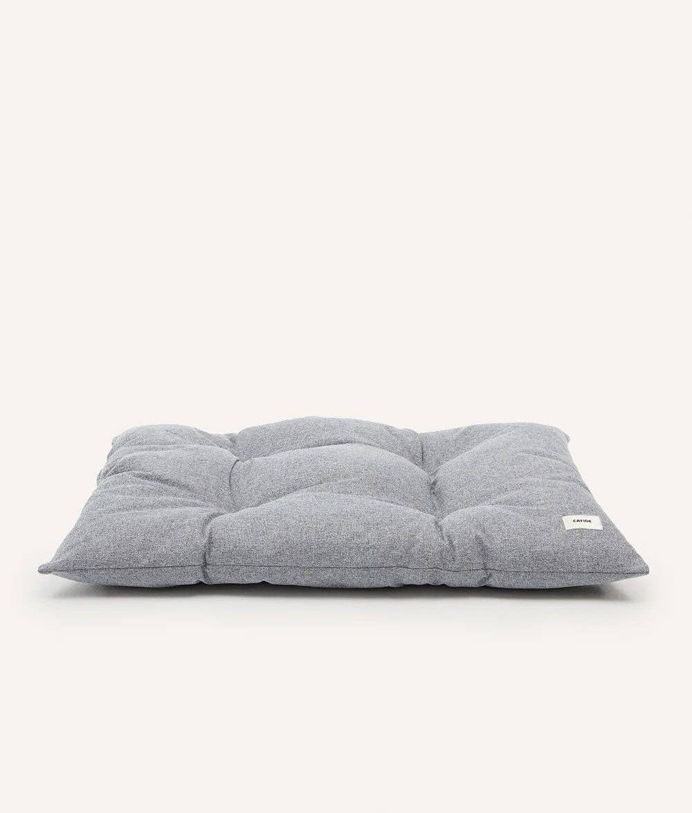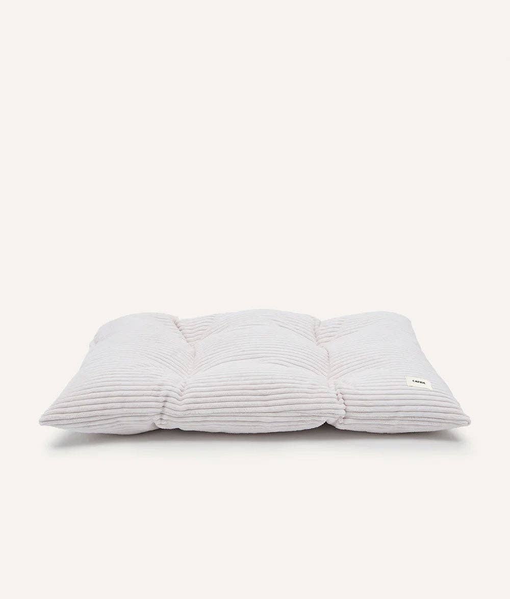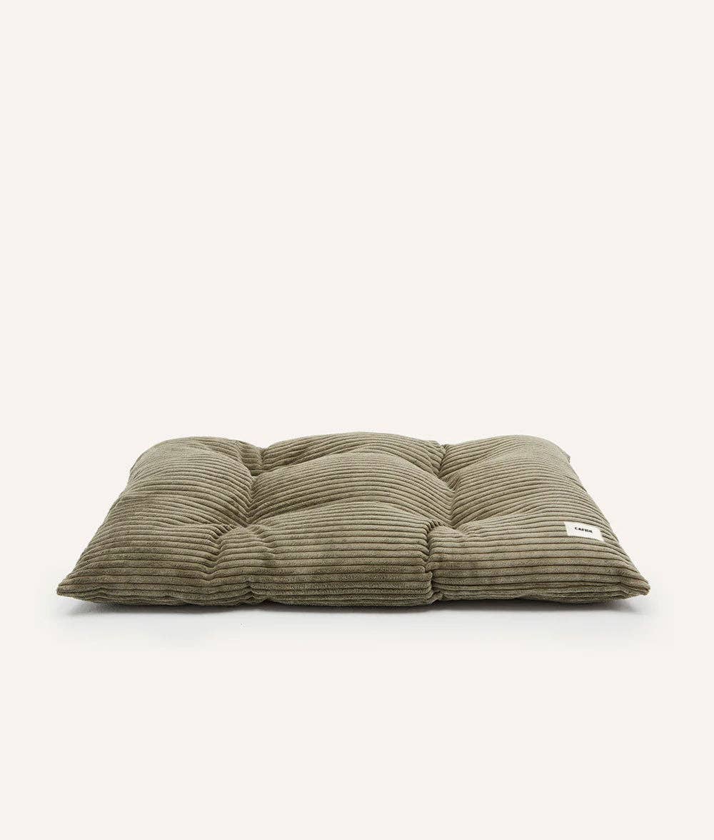 Cojín para perro con tejido pana en tacto afelpado y suave fabricado en Europa. El relleno es de fibra reciclada hecha de botellas recicladas. Se puede poner en la lavadora.