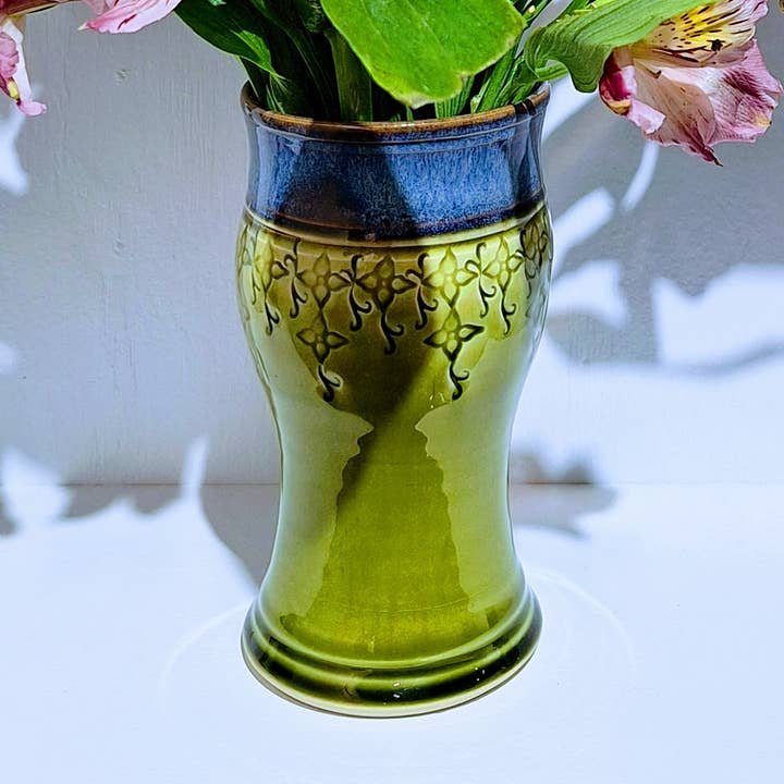 El gran jarrón de patrón completo en Peacock Stella es una obra maestra atemporal de elegancia y arte. Con unas medidas aproximadas de 19 cm de alto y 7,5 cm de ancho, este jarrón presenta un diseño intrincado creado con los sellos hechos a mano de Kelsey Schissel, un delicado motivo de estrella y espiral único en su trabajo. El patrón envuelve todo el jarrón, incluso la base está adornada y marcada con la firma "k" de Kelsey incrustada en el diseño. Perfecto para realzar centros de mesa en la sala de estar, exhibiciones en la repisa de la chimenea, decoración de oficina, acentos en el dormitorio o encimeras de cocina, este jarrón eleva cualquier espacio. Es una elección ideal para bodas, aniversarios, cumpleaños importantes o como un lujoso regalo de inauguración de casa. Elaborado con precisión e intención, el jarrón con el patrón Stella Peacock es el epítome de la elegancia y la funcionalidad. Añade este exclusivo tesoro hecho a mano a tu tienda y ofrece a tus clientes una pieza de arte inigualable.