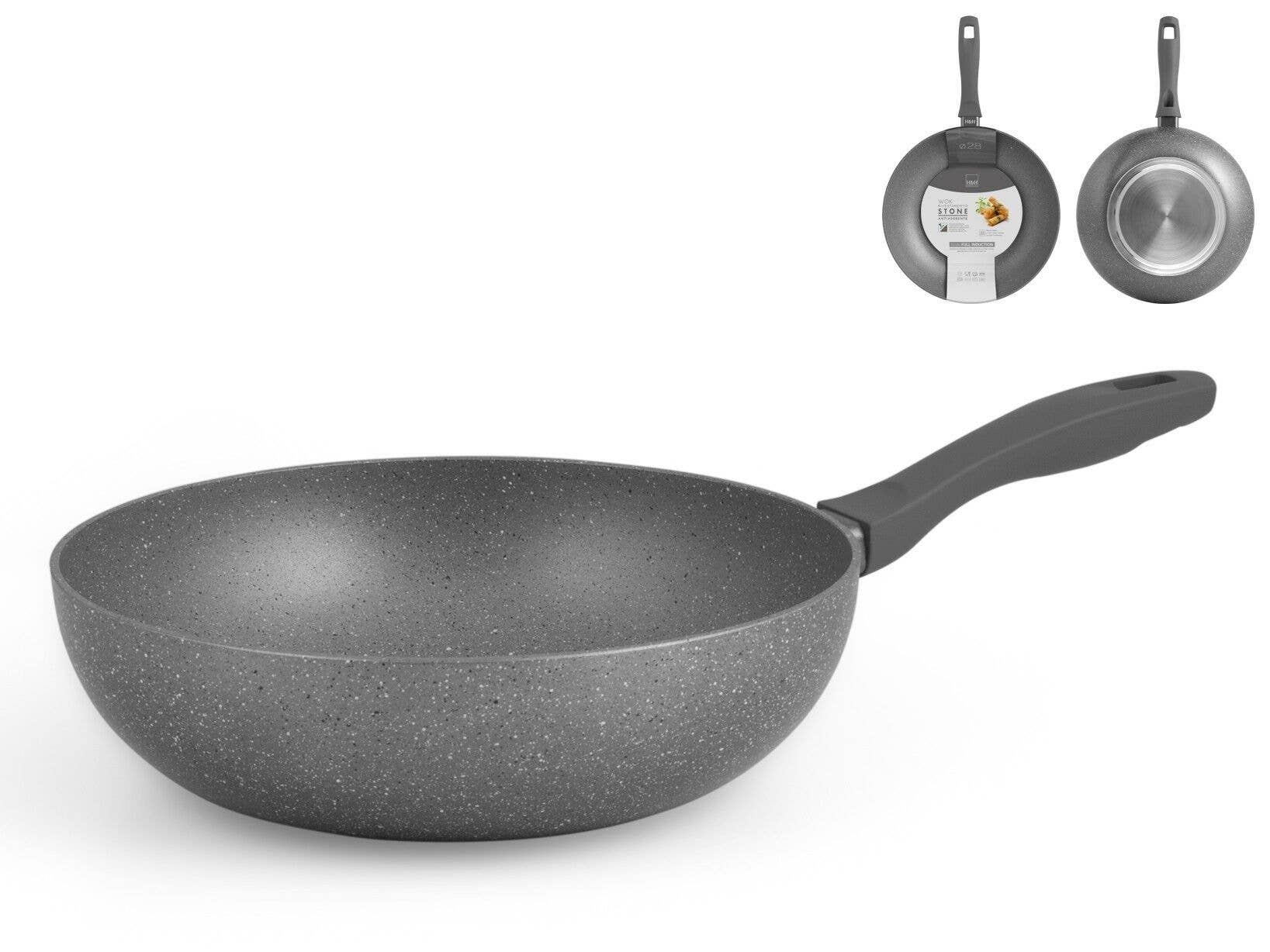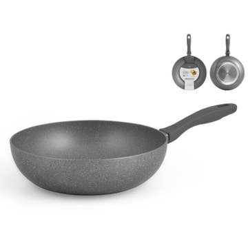 Sartén de aluminio Jumbo, muy gruesa, con 2 asas de acero inoxidable fundido, antiquemaduras. Gracias a la forma redondeada del fondo, se reduce el tiempo de cocción, lo que se traduce en un ahorro de energía. Doble fondo patentado con superficie plana adecuado para todas las superficies de cocción, incluida la inducción. También se puede utilizar en el horno. El exclusivo Biostone Pro es un revestimiento STONE EFFECT de 9 capas reforzado con minerales duros, sin PFOA ni PFAS. Ambos recubrimientos son completamente a base de agua y están libres de disolventes nocivos.