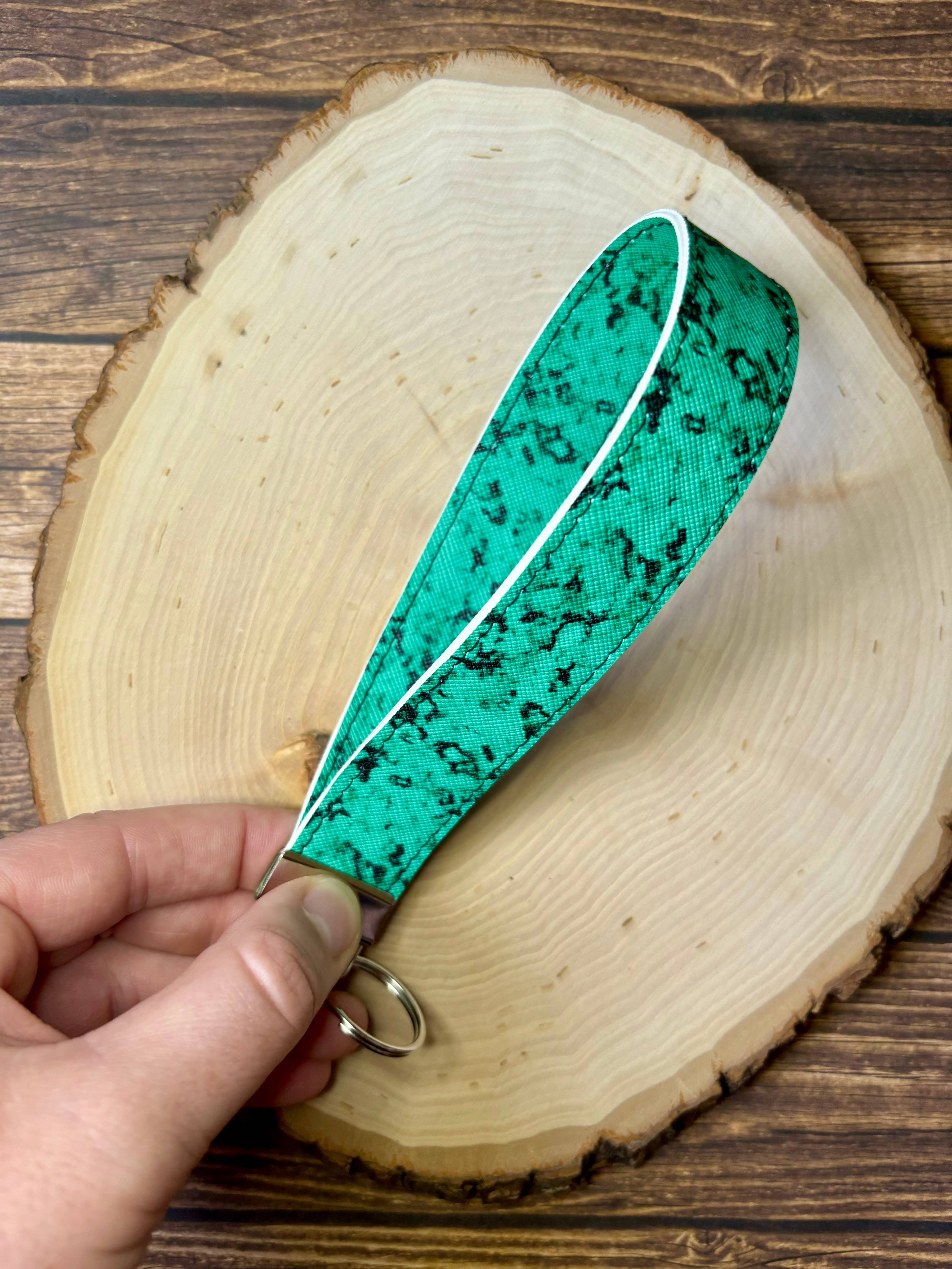 ¡Un nuevo llavero de muñeca acaba de llegar a la tienda! Hecho de cuero sintético para que no tengas que preocuparte de que la tela se ensucie. Cada llavero tiene doble respaldo de cuero sintético, pegado en caliente en el medio y luego cosido para dar un aspecto limpio y acabado. Cada llavero de muñeca tiene 1 pulgada de ancho y 6-7 pulgadas de largo, dependiendo del diseño. Dado que cada diseño se corta de una hoja diferente de cuero, la longitud varía. La capa exterior es un estampado de animales de safari en verde, mientras que la capa interior es de cuero sintético verde guijarro. Pueden ocurrir ligeras variaciones ya que cada producto está hecho a mano.