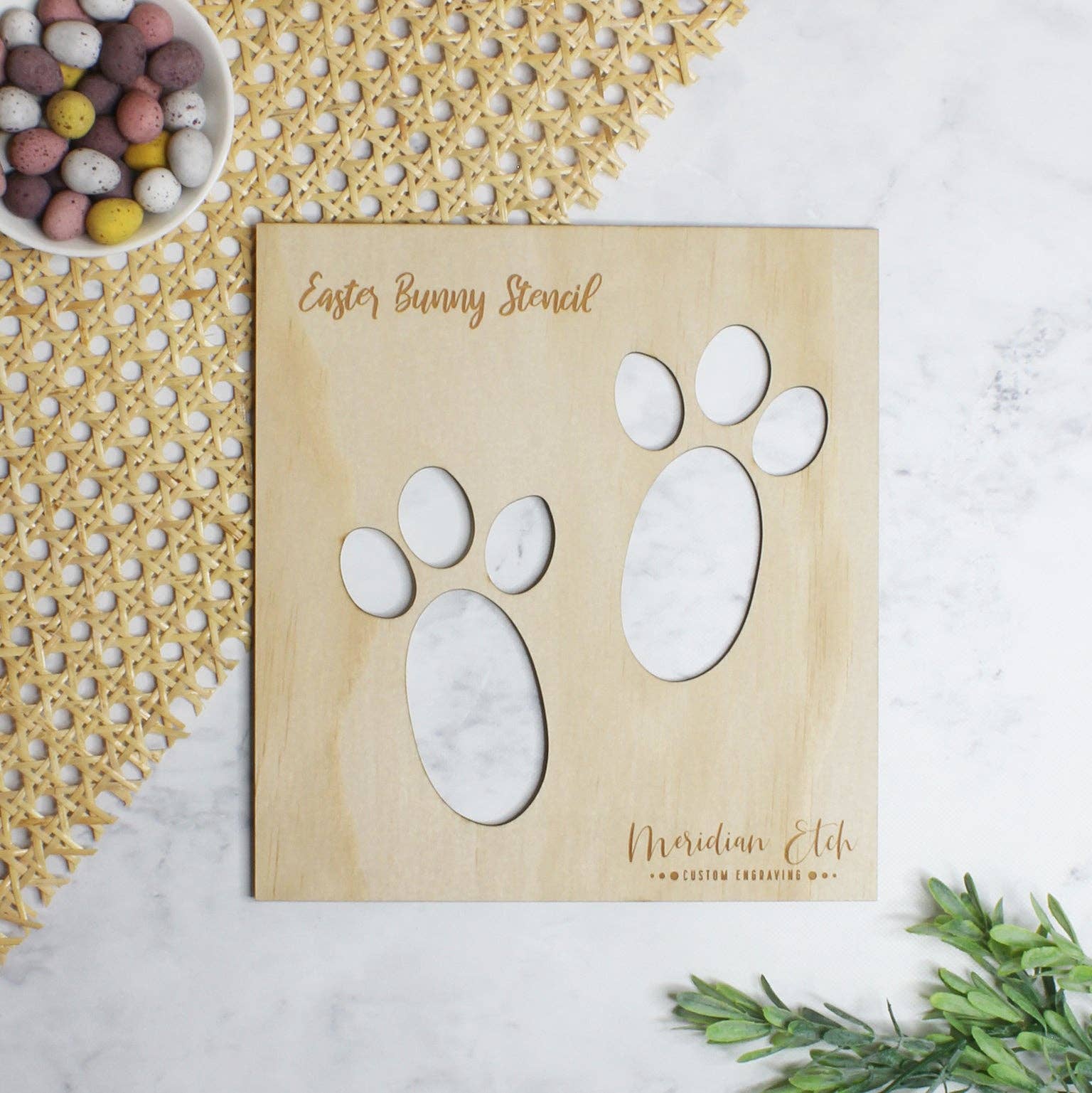 Plantilla de madera con forma de huella de conejo de pascua. ¡Mira cómo se iluminan sus caritas! Da vida a la magia del conejo de Pascua en la mañana de Pascua con huellas fáciles de espolvorear con harina. ¡Nuestra plantilla de madera de calidad significa que ya no tendrás que imprimir y recortar plantillas de papel y cartón la noche antes de Pascua! Especificaciones: * Hecho de madera contrachapada de 4 mm * Dimensiones: 8,2 cm x 12 cm Cómo usar tu plantilla: * Coloque la plantilla en el suelo * Con harina común en un colador, golpee suavemente el costado del colador mientras lo sostiene aproximadamente 20-30 cm por encima de la plantilla * Asegúrate de no espolvorear demasiado en un solo lugar, de lo contrario la harina se acumulará y se caerá cuando levantes la plantilla * Una vez que hayas cubierto la plantilla con una capa uniforme (y ligera) de harina, coge suavemente la plantilla con las dos manos.