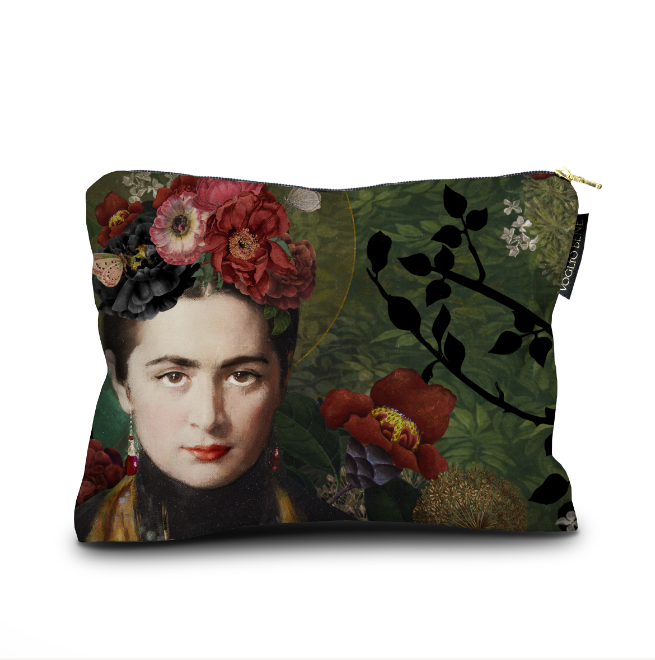 Estuche de 17 x 23 cm impreso en terciopelo, con diseño en ambos lados. Terminación con cremallera dorada.