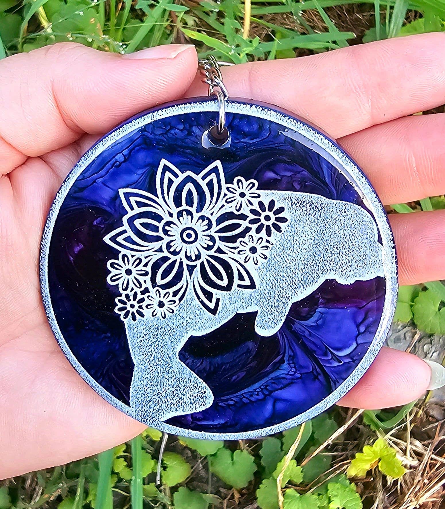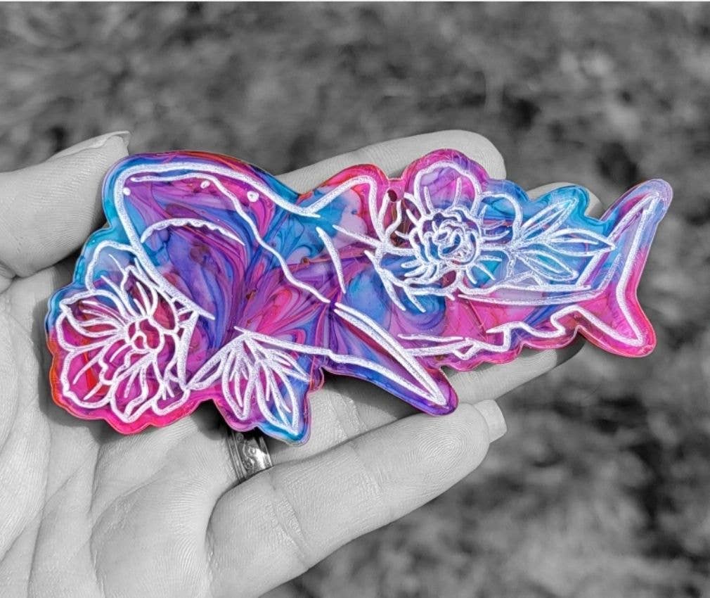 El colorido llavero Orca está hecho de resina. El tamaño es de aproximadamente 4 pulgadas de largo. *Los colores pueden variar ligeramente ya que cada uno es hecho a mano y único.