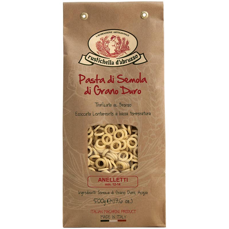Pasta de sémola de trigo duro de alta calidad. Sugerimos combinarla con Aceite de Oliva Virgen Extra, una excelente fuente de energía y ácidos grasos esenciales, producido a partir de aceitunas provenientes del área vestina denominada "triángulo de oro" con un sabor decidido pero no fuerte, es apto para todos.