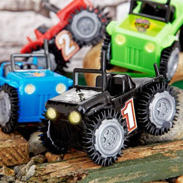 ¡La aventura llama! Con ruedas robustas acabadas en goma y amplio espacio de almacenamiento, este vehículo todoterreno es la mejor opción para emocionantes recorridos por el salón y terrenos irregulares. Detalles adecuados como un cabrestante impreso y una rueda de repuesto completan el aspecto de este gran SUV fabricado con madera certificada FSC® 100%. Las aberturas en las ventanas permiten que las manos pequeñas agarren bien este vehículo.