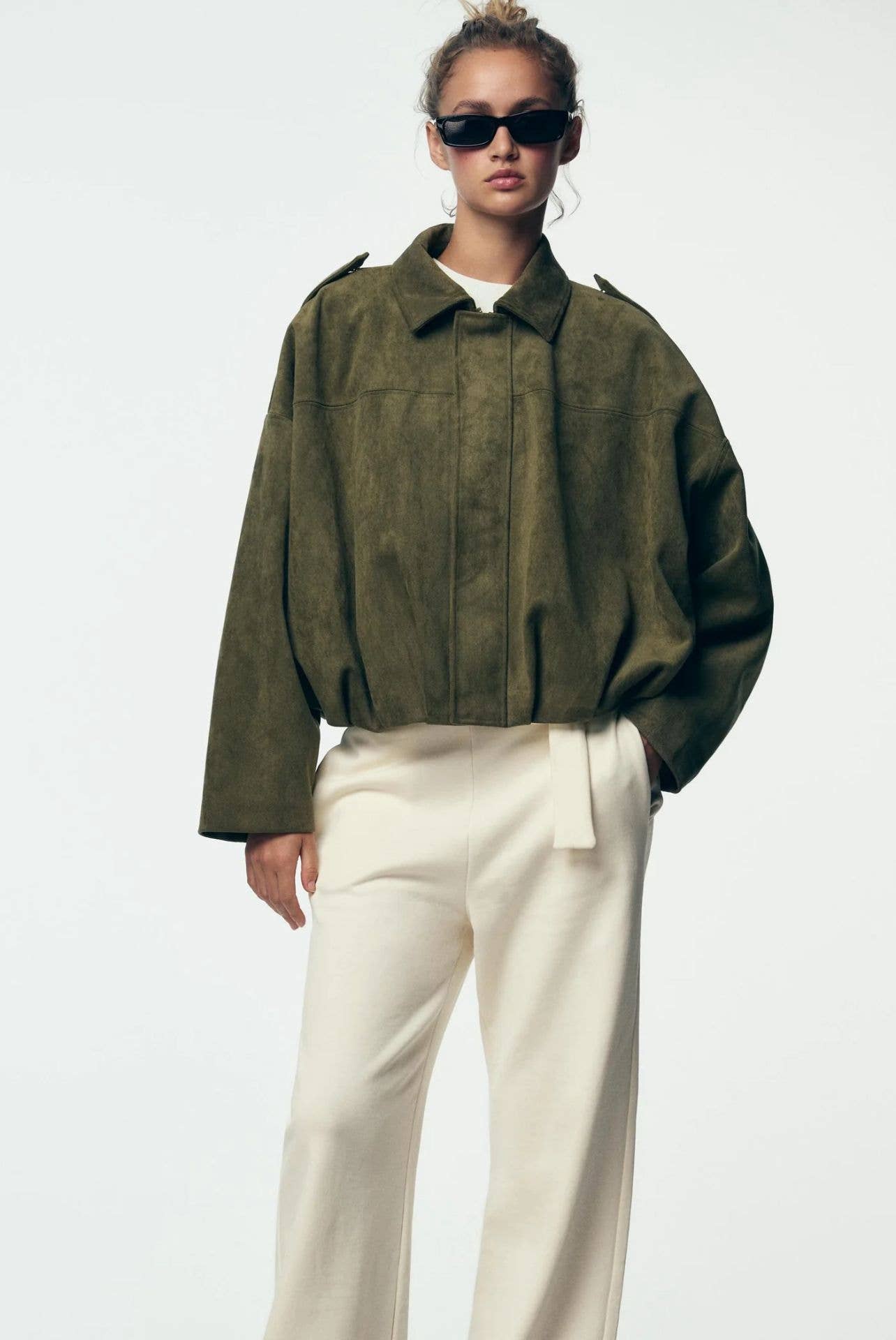 Chaqueta bomber de manga larga en color sólido, con cuello mao y pinzas delanteras. La modelo mide 1,76 m y lleva una talla S.