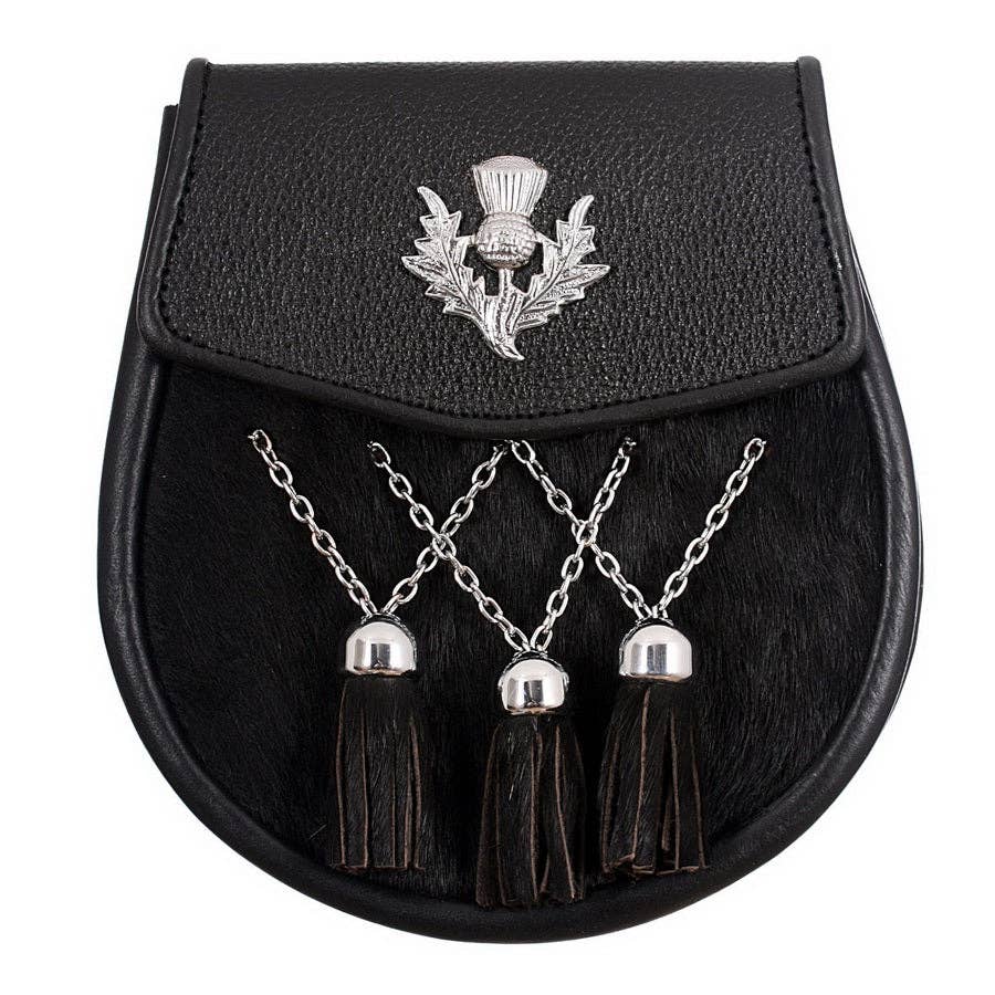 Cantle celta Sporran cromado liso, piel de conejo negra al por mayor