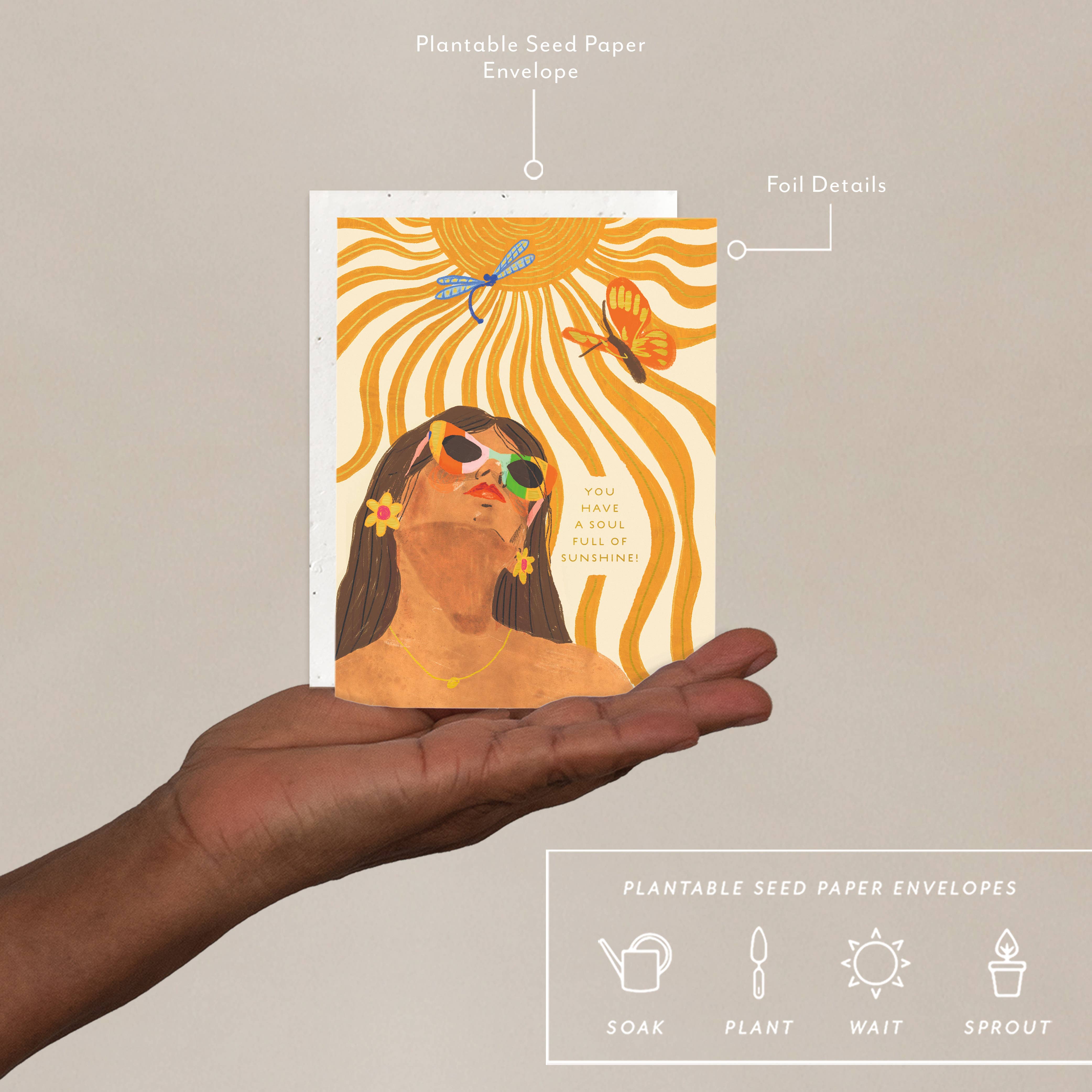 Todas las tarjetas de felicitación de Seedlings tienen detalles en papel de aluminio y un sobre de papel con semillas PLANTABLE, que está impregnado con semillas de flores silvestres. Este papel con semillas está hecho de un papel ecológico biodegradable creado con materiales postconsumo, ¡sin árboles dañados para este papel! Cuando se planta, nuestros sobres se descomponen dejando solo flores. En blanco por dentro, nuestras tarjetas están impresas en papel de primera calidad y todas están acentuadas con detalles en papel de aluminio. Todas las tarjetas de Seedlings se fabrican en EE. UU. ¿Necesitas un expositor? Pide BOUDIS48 para un expositor giratorio de 48 bolsillos o BOUDIS24 para nuestro expositor giratorio de 24 bolsillos. Todas nuestras tarjetas también están disponibles SIN celofán. ¡Envíanos un mensaje si quieres tus tarjetas al desnudo! Tamaño de la tarjeta: 4.25" x 5.5" Sobre: 4.3125" x 5.75" (A2)
