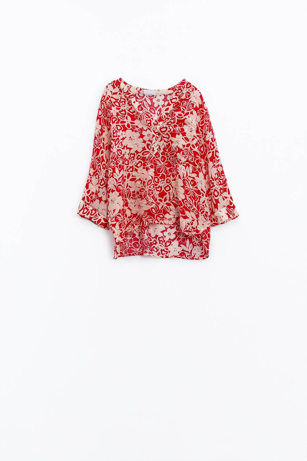 Blusa morada con cuello en V y manga abullonada con estampado floral de talla grande