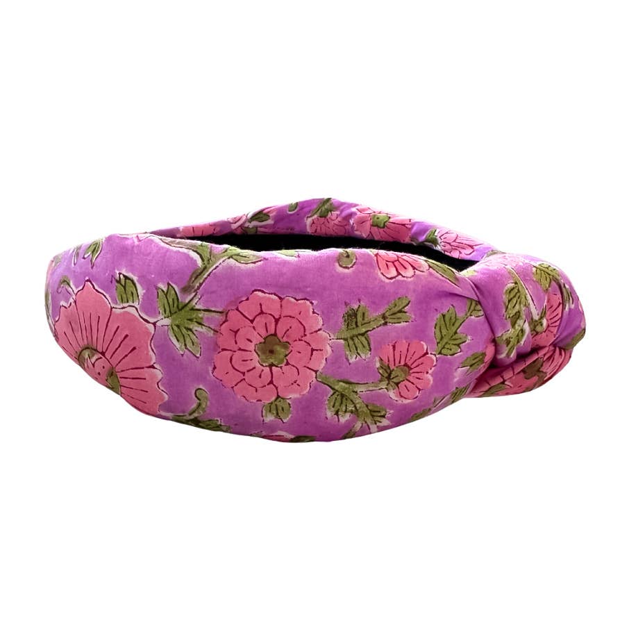 Diadema anudada con estampado de bloques a mano con estampado floral verde y azul. -Forro de diadema rosa -Con el logotipo de Bohemian Gemme -Cómodo para usar todo el día -100% tela de algodón con estampado de bloques -Hecho a mano en EE. UU.