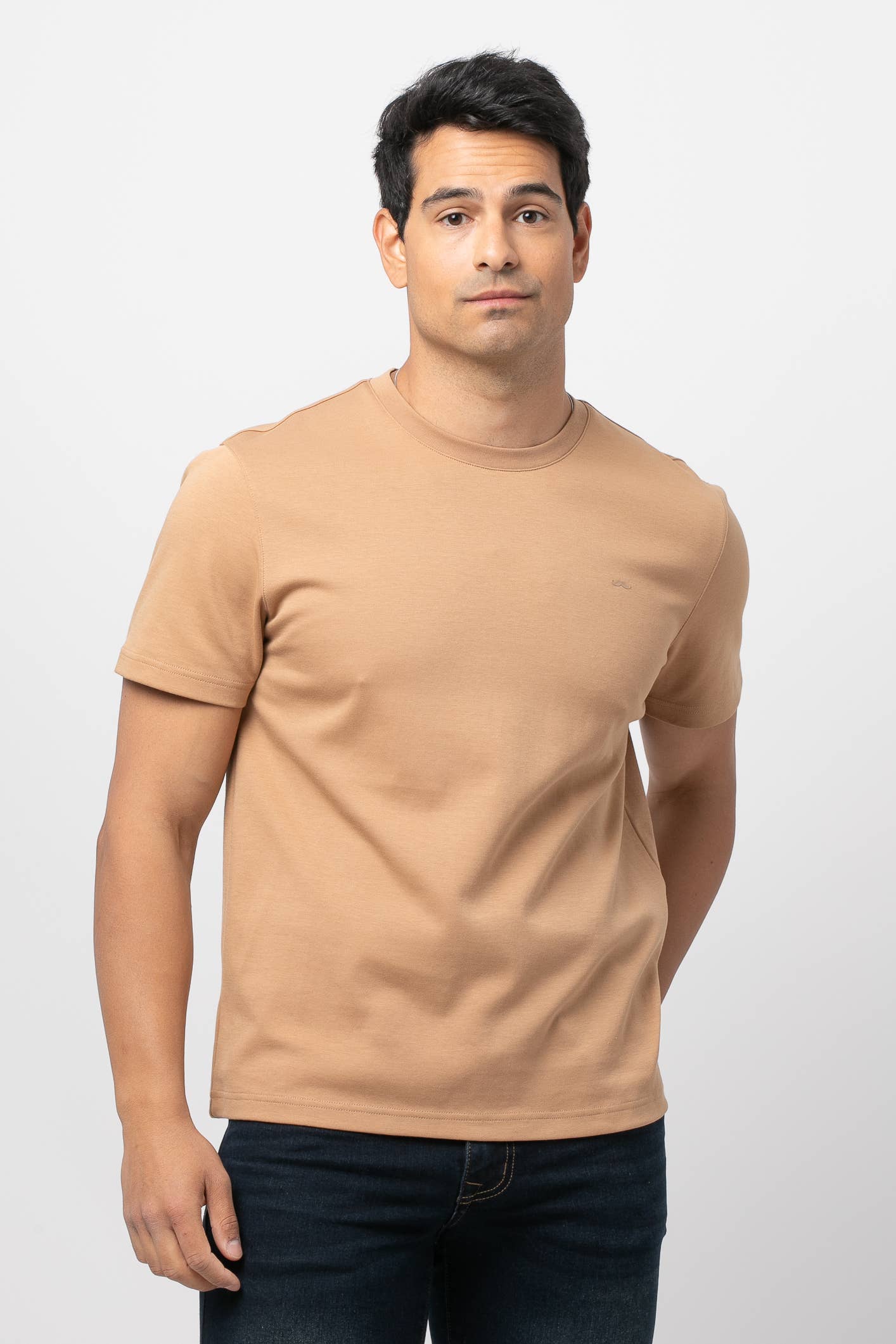 Camiseta básica de manga corta confeccionada en algodón de alta calidad para máximo confort y suavidad. Diseño liso con cuello redondo y bajo recto. Logo de nuestro icónico bigote bordado en el pecho. Perfecta como fondo de armario o para looks relajados y modernos.
