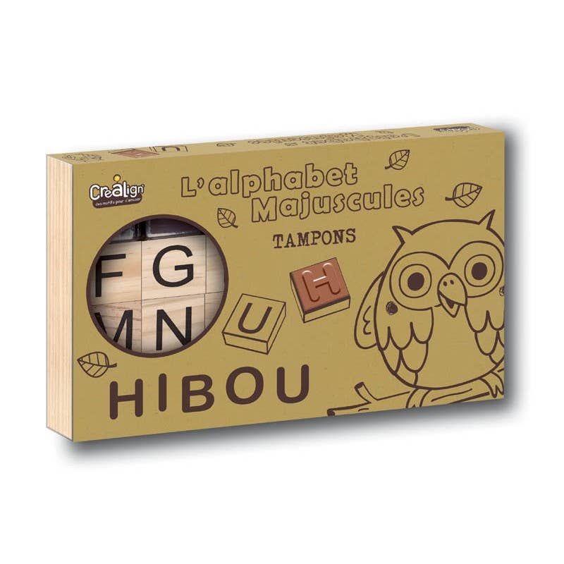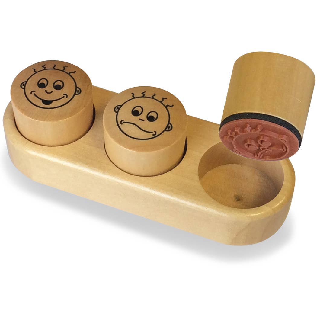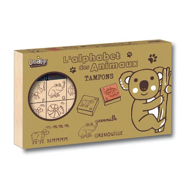 Una caja de madera pequeña con sellos serigrafiados para personalizar tus cuadernos, escribir textos y números.