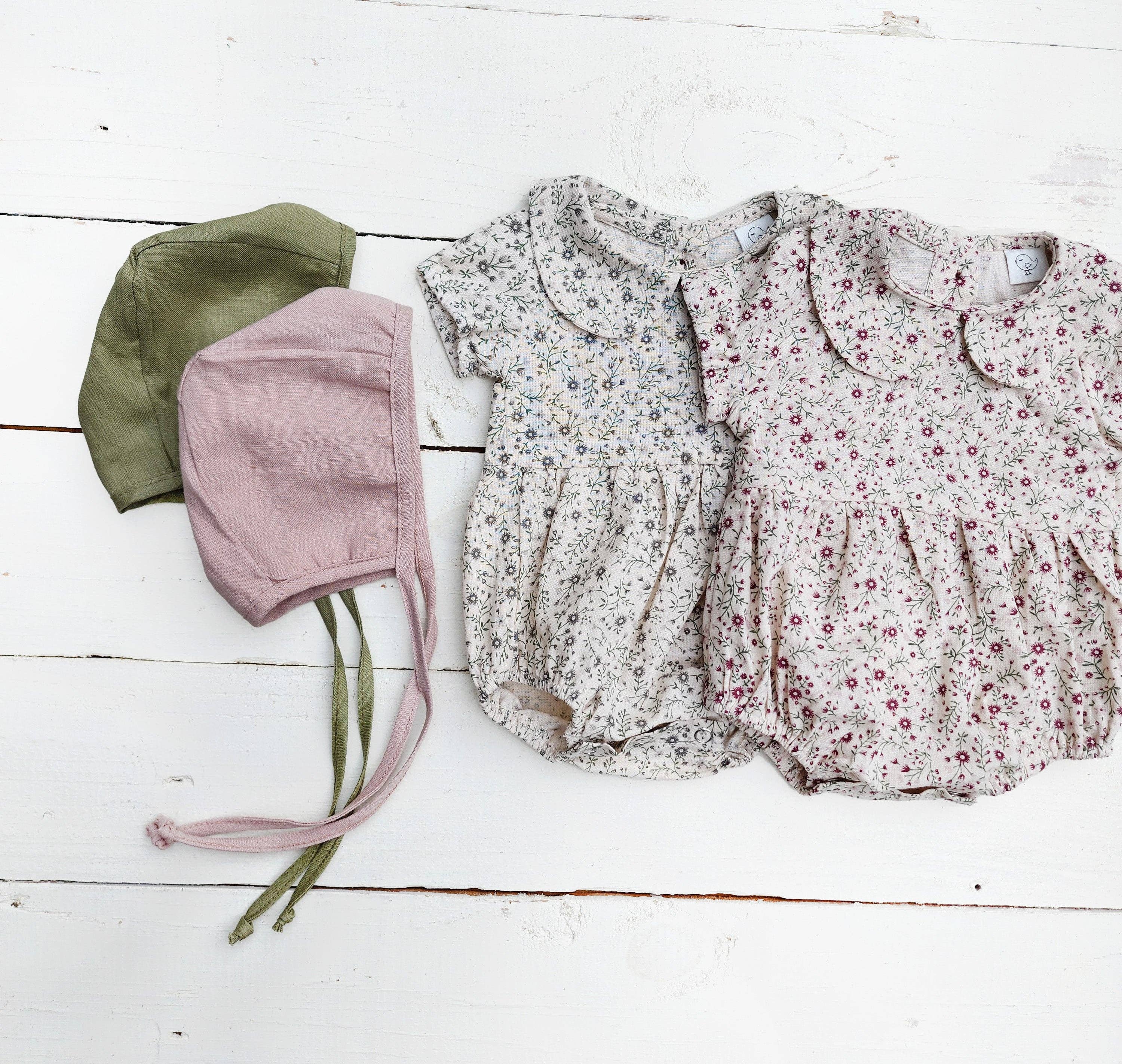 Disponible en cuatro colores atemporales, cada jumper incluye un moño para la cabeza a juego que completa el conjunto. Detalles: - Diseño de manga corta, ideal para días cálidos o para combinar con un cárdigan - Mangas con volantes para un toque encantador - Botones de madera funcionales en la parte frontal - Broches en las piernas para facilitar el cambio de pañal - Confeccionado con lino 100 % - Prenda fotogénica y atemporal Descripción de colores: - Oat: color natural del lino - Ash blue: azul grisáceo suave - Vintage Pink: rosa apagado pálido o rosa beige - Plum: tono ciruela oscuro, berenjena o púrpura oscuro apagado Instrucciones de cuidado: - Lavar a máquina en ciclo suave con agua fría y colores similares - Secar en horizontal o colgado - Planchar a alta temperatura si es necesario