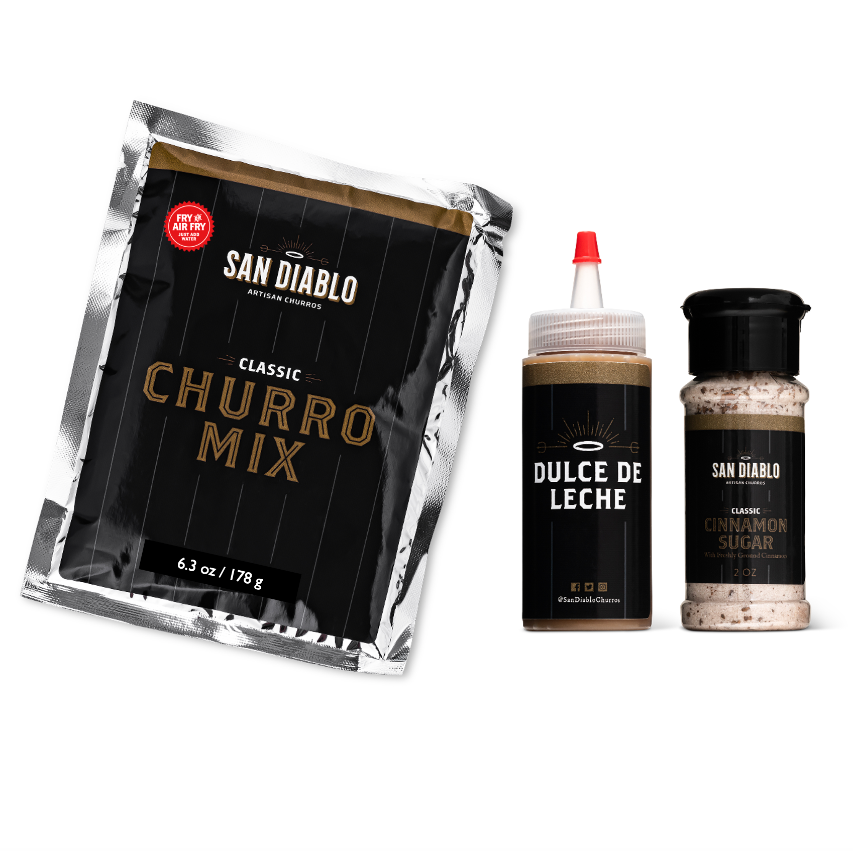 ¡Fácil de freír o freír al aire churros frescos en menos de 10 minutos! Es el regalo perfecto para enviar a cualquier parte del mundo, o para hacer churros en tu próxima actividad familiar, noche de cita, noche de postres, evento de formación de equipos o celebración festiva. (Para regalos corporativos o pedidos grupales, haz clic aquí.) Nuestro kit para hacer churros tiene todo lo que necesitas para hacer churros: * San Diablo Premium Churro Maker (gadget de cocina gourmet) * 9 boquillas intercambiables para churros * Nuestra mezcla para churros galardonada, solo añade agua (hace ~18 mini churros, de 2.5–3 pulgadas cada uno) * Tu elección de relleno: Dulce de Leche o Nutella * Clásico espolvoreador de azúcar con canela * Halo de ángel y cuernos de diablo * Mini tridentes de diablo para comer churros con estilo * Planificador de fiesta con ideas para fiestas, consejos, datos curiosos y recetas * Libro electrónico de recetas y videos de Churro University: instrucciones fáciles de seguir, consejos, más de 40 recetas de relleno de chefs destacados, y nuestra receta galardonada de masa para churros (opciones clásicas, sin gluten, sin azúcar y veganas). ¡Recetas también en español! * Hermosa caja de regalo con un lazo rojo brillante También disponible en estas opciones para aún más (o más picantes) churros: DOBLE TAMAÑO: Doble de mezcla para churros (2 paquetes), 2 botellas de relleno y 2 espolvoreadores de azúcar con canela. TRIPLE TAMAÑO: Triple de mezcla para churros (3 paquetes), 3 botellas de relleno y 3 espolvoreadores de azúcar con canela. FIESTA PICANTE EN UNA CAJA: Incluye 2 sabores adicionales de azúcar con canela: * Estilo Diablo (Suave): azúcar + canela + pimienta de cayena * Estilo Infierno (Picante): azúcar + canela + polvo de habanero