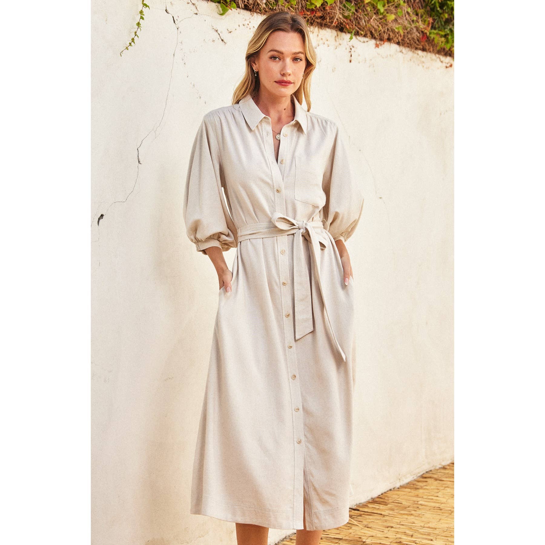 FD7107_1 Este vestido midi con estampado floral presenta un dobladillo tipo pañuelo, detalles ceñidos a lo largo del cierre con botones y mangas largas con puños elásticos. La modelo en color TAUPE/MULTI mide 1,70 m y lleva la talla S. Exterior: 100% poliéster Forro: 100% rayón