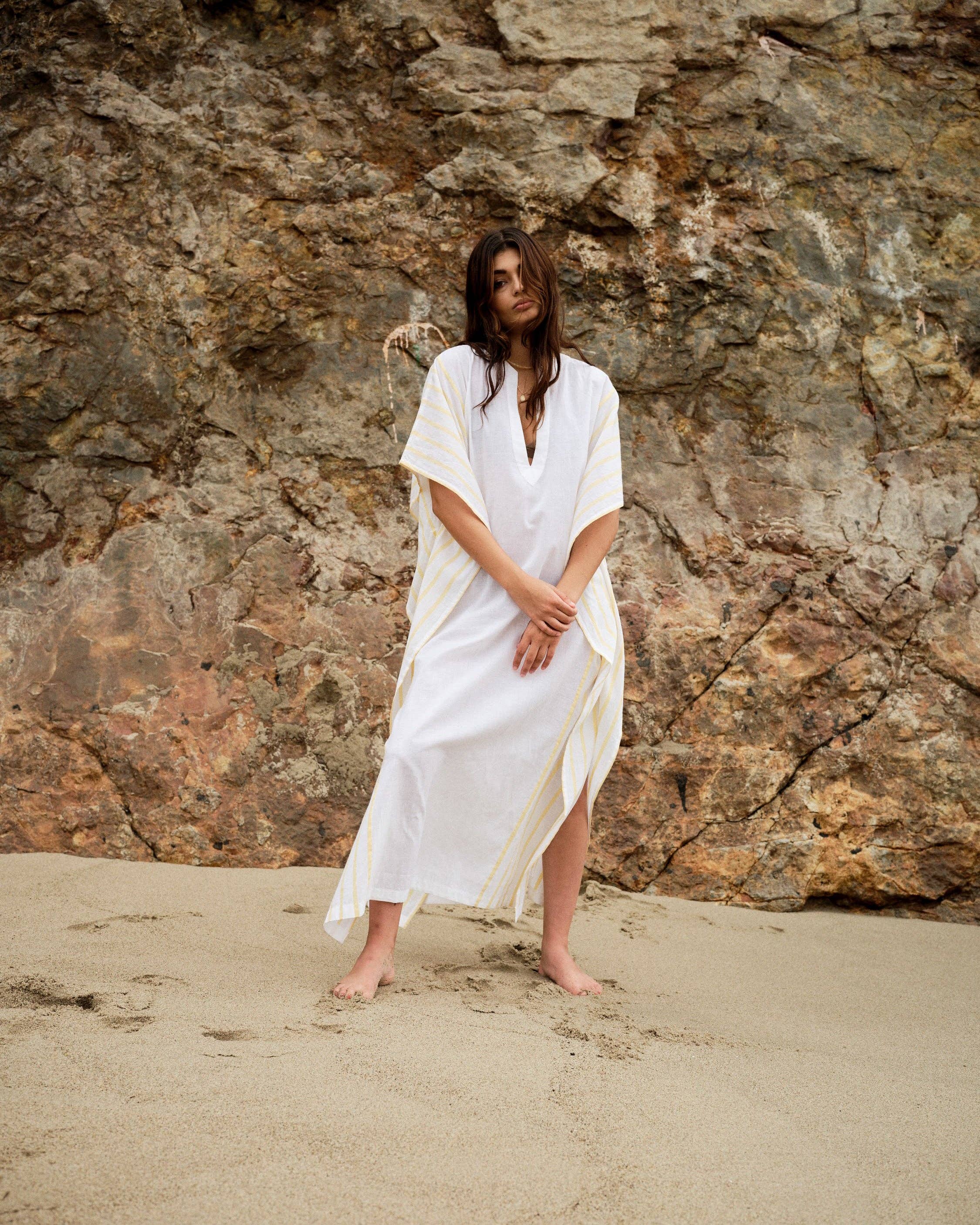 Grâce à des méthodes et à des matériaux durables de première qualité, Pondichérie produit des pièces raffinées avec une facilité d'esprit qui transcende le temps et fait allusion à des lieux lointains. Chacune de nos pièces a sa propre histoire, quelque chose que nous espérons que vous garderez dans votre vie et que vous chérirez au fil des années d'aventures. Pondichérie valorise à la fois l'artisanat, l'âme et le style. Nous nous engageons à trouver la beauté tout en créant des changements, et le résultat est une gamme artisanale de vêtements de villégiature respectueux de l'éthique. Nos collections inspirées des caftans évoquent une élégance intemporelle tout en privilégiant les pratiques durables. Chaque vêtement est tissé pour Pondichérie par des artisanes en Inde, avec un accent particulier sur l'autonomisation et le soutien de nos artisans. Chaque pièce de tissu est teinte à la main et tissée selon des techniques transmises de génération en génération.