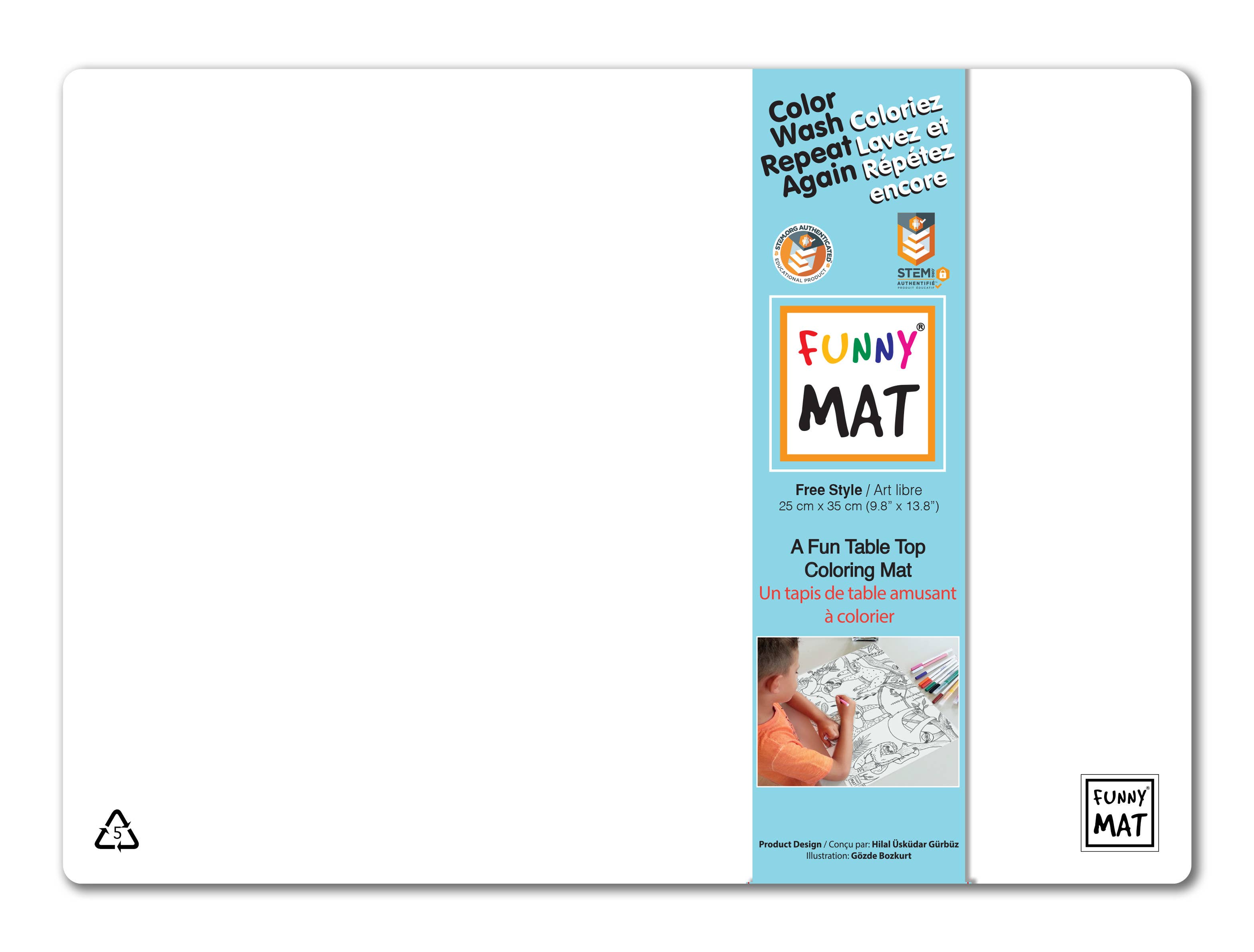 Funny Mat®, distribuée par Crestar Ltd. en Amérique du Nord, est une gamme de produits de coloration lavables et réutilisables conçus pour favoriser le développement personnel des enfants, améliorer leur créativité et augmenter leurs capacités cognitives et motrices en même temps. La gamme de produits comprend des tapis de table transparents, blancs ou noirs imprimés avec des motifs originaux en noir et blanc protégés par des droits d'auteur, des puzzles à colorier lavables, des mini-ensembles de carnets à spirale, des t-shirts, des cahiers interminables et des livres d'art sans fin. Les produits Funny Mat® sont fabriqués en polypropylène et sont donc recyclables.