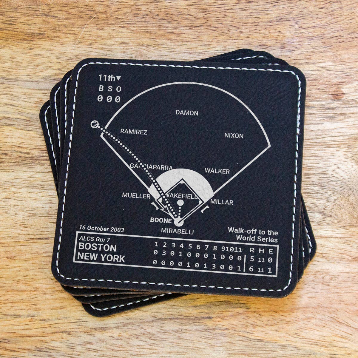 En tant que fans de sport, nous avons tous nos pièces préférées. Ces pièces concernent autant nous, les fans, que les équipes et les joueurs. Nous nous souviendrons toujours de ce que ces moments signifient pour nous. Chacun de nos produits raconte une histoire, que vous pouvez partager avec vos invités ou revivre en attendant le début d'un match. Cette entreprise a commencé avec un ensemble de dessous de verre en ardoise qui était un cadeau pour le 30e anniversaire de mon frère. Avec lui à 3000 miles, nous n'avons pas souvent l'occasion de regarder des matchs ensemble, mais le sport a toujours été un lien fort entre nous. J'ai fait des recherches sur les moments les plus importants de l'histoire de son équipe et j'ai schématisé les pièces pour qu'il puisse les revivre chaque fois qu'il s'asseyait à sa table basse. Avec plus de 14 000 avis cinq étoiles... nous sommes devenus une marque que les clients adorent et en qui ils ont confiance. **REMARQUE : Aucun joueur sportif, aucune équipe, aucune ligue ou aucune équipe des séries éliminatoires n'est affilié à Playbook Products™ ou n'est à l'origine de ces produits, n'en est responsable ou n'a approuvé, sponsorisé ou autorisé ces produits. **