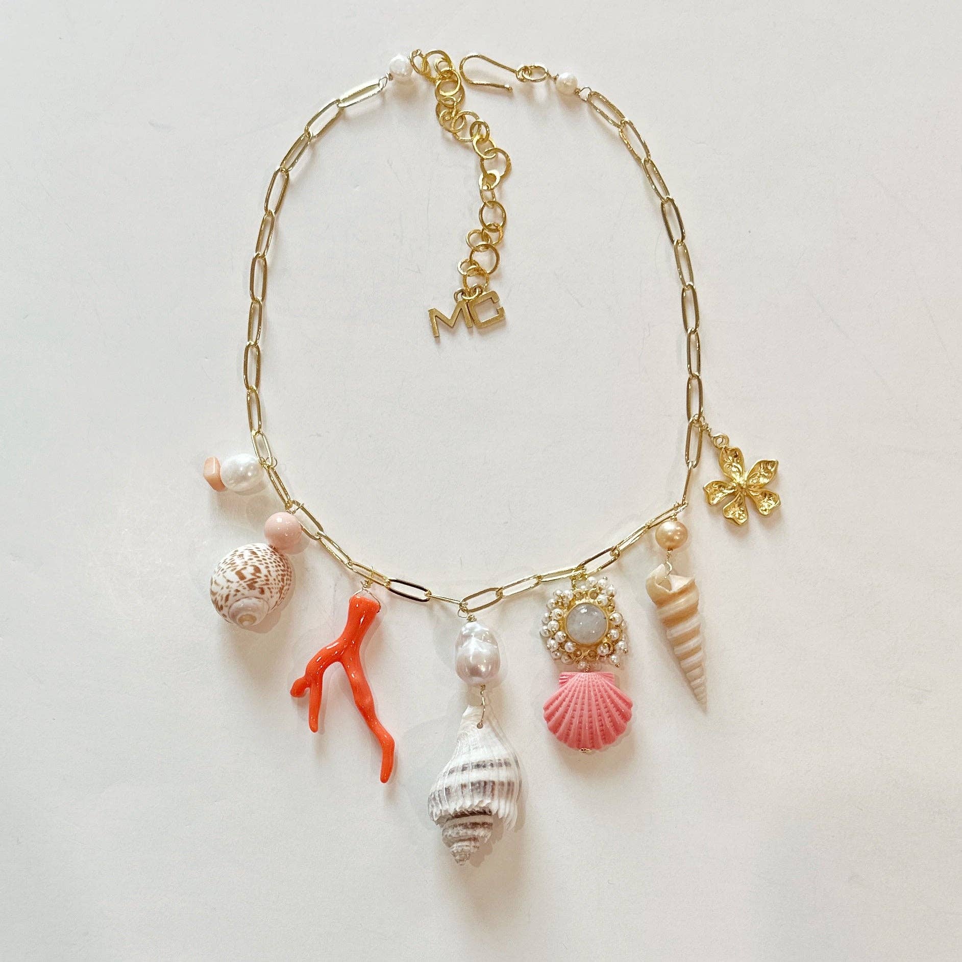 Inspirée par l'amour de la mer et du jardin, la collection Meg Carter designs est fabriquée à la main en Virginie avec des perles d'eau douce, des pierres semi-précieuses, des fleurs faites à la main et des coquillages naturels. Lors d'un voyage à la maison de plage de ses parents il y a deux décennies, le plus jeune fils de Meg Carter, alors âgé de cinq ans, a acheté chez elle une cage remplie de crabes ermite. Lorsque l'un des crabes a abandonné sa maison, Carter, diplômé de Dartmouth qui a quitté une carrière de consultant à la naissance de son premier fils, n'a pas supporté de jeter la coquille unique et nacrée. Au lieu de cela, elle l'a fait passer dans le lave-vaisselle et a trouvé un moyen de l'attacher à une ficelle de perles. « C'est mon père qui m'a aidé à le comprendre. C'était un artisan amateur talentueux qui construisit des maquettes de navires et des meubles. J'utilise encore certains de ses outils ». Quand ses amis d'été dans le Maine ont vu le tour de cou en coquille, ils ont supplié Carter d'en faire plus.
